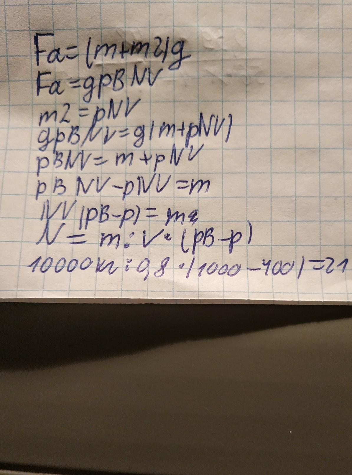 Определите, какое минимальное число сосновых брусьев (р = 400 кг/м^3) объемом V = 0,8 м^3 каждый необходимо взять для того, чтобы связать плот для переправы через реку груза массой m = 10 т. Плотность воды р(в) = 1000 кг/м^3. Коэффициент g принять равным 10 Н/кг