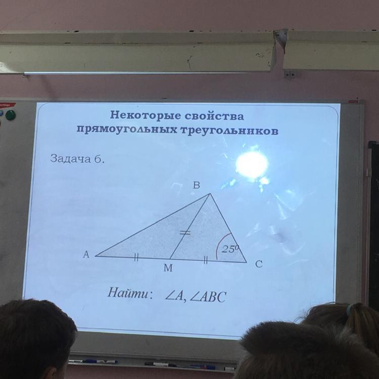 Треугольник CMB - равнобедренный ,тогда ∠MBC = ∠MCB = 25° ,тогда ∠BMC = 180 - ∠MBC -∠MCB = 130°. ∠AMC - развернутый ,тогда ∠AMB = 180 - ∠BMC = 50 °.Треугольник AMC - равнобедренный ,тогда ∠MAB = ∠MBA = (180 - ∠AMB)/2 = 65°. ∠ABC = ∠MBC + ∠MBA = 90°