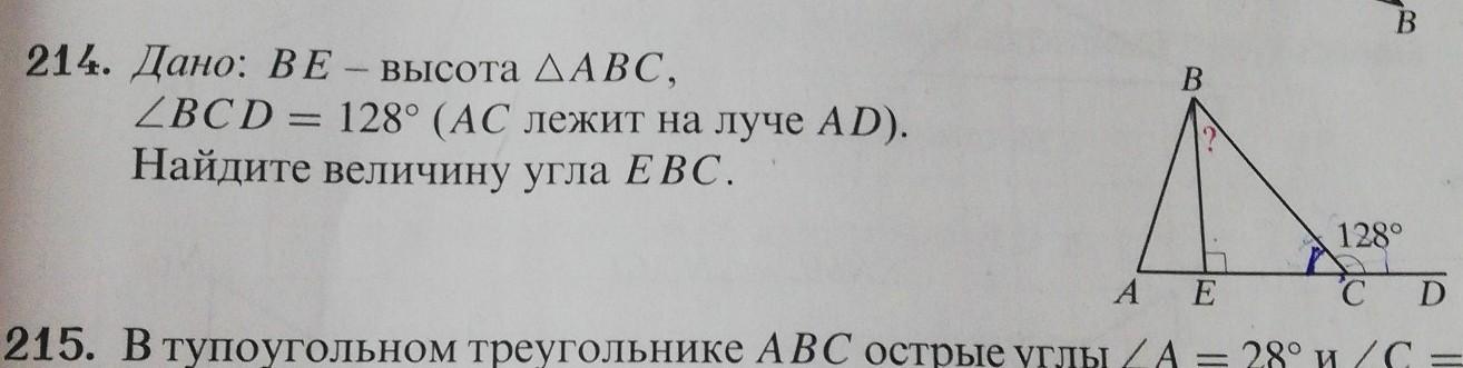 угол ЕСВ = 180 - 128 = 52 градуса