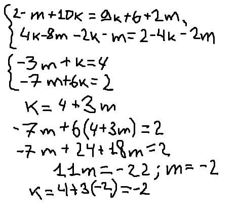 {2−5(0,2m−2k)=3(3k+2)+2m