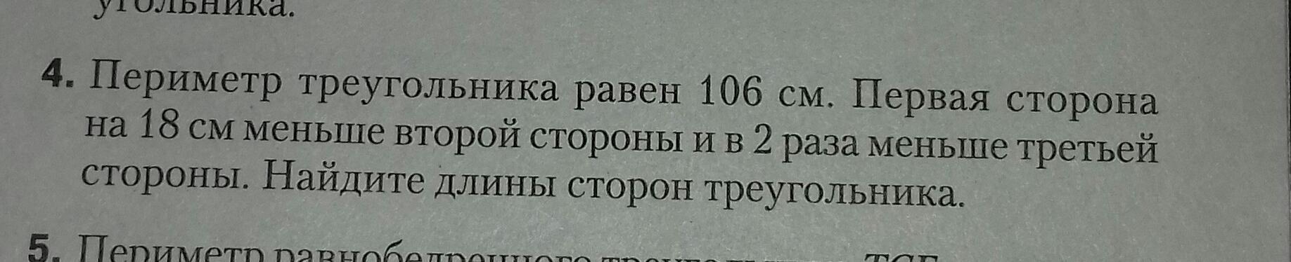Периметр треугольника - сумма длин его сторон. Пусть x см - первая сторона, тогда (x+18) см - вторая сторона, (2x) см - третья. Периметр равен 106 см. Составляем уравнение: