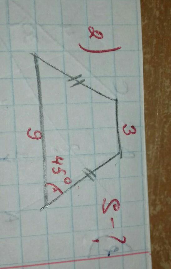 3. Рассмотрим треугольник треугольник сформированный из высоты, одной боковой стороной и "катет - разнице между основаниями деленной на 2". этот треугольник равнобедренный, прямоугольный в котором катет равен высоте = (9-3):2=3 см