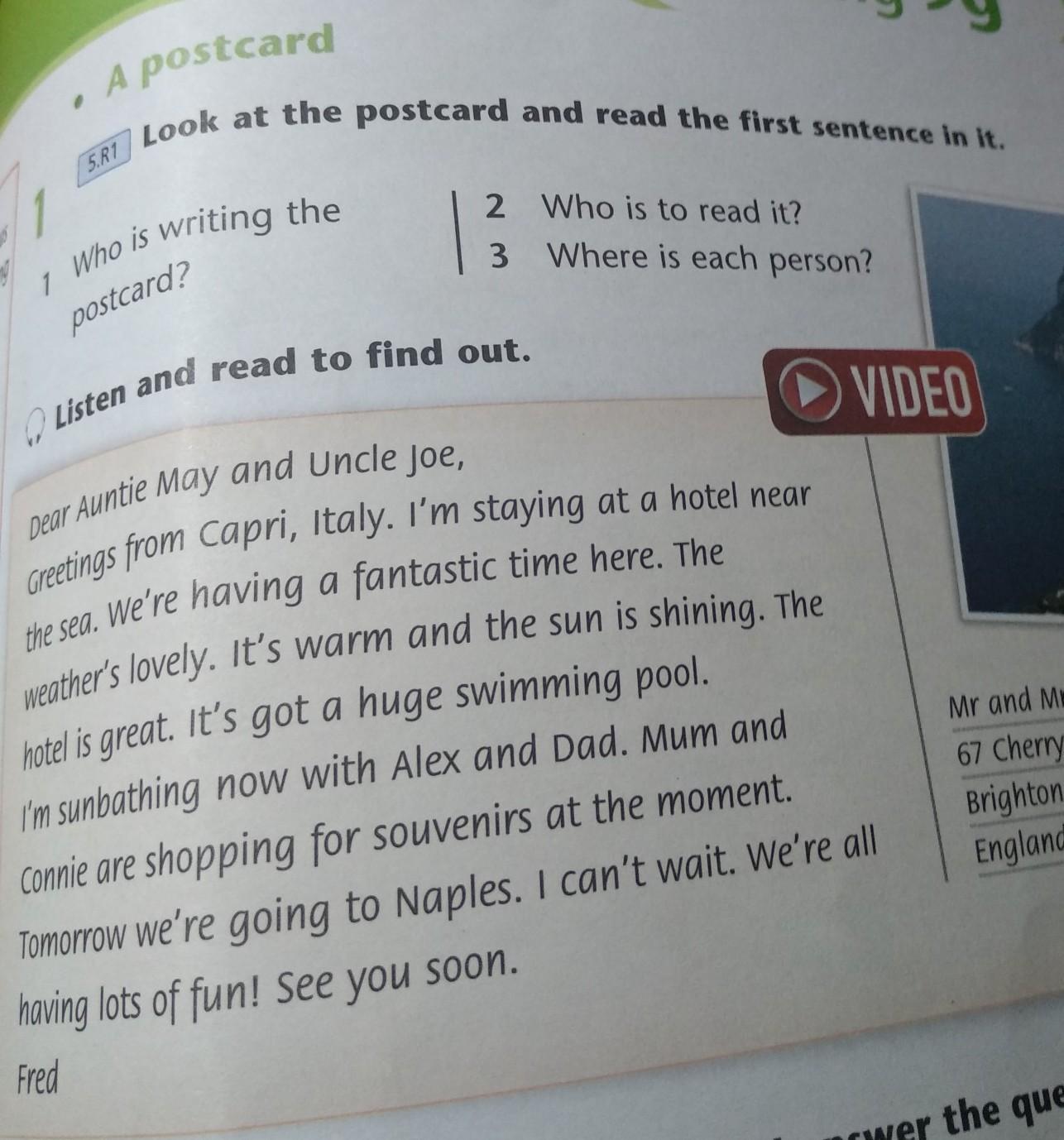 1-Fred is writing the postcard.