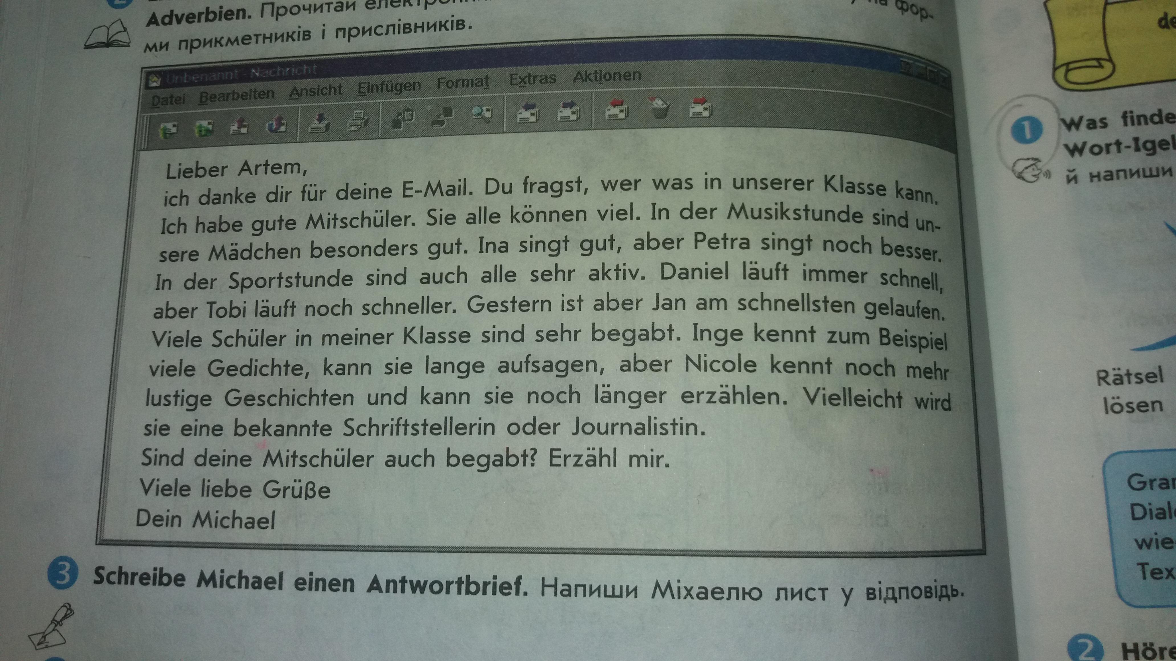 благодарю за твоё сообщение. Ты спрашивал, кто на что способен в нашем классе. У меня хорошие одноклассники. Они очень талантливые. На уроках музыки наши девочки особенно хороши. Ина отлично поёт, но Петра поёт намного лучше. На уроках физкультуры все очень активны. Даниэль всегда быстро бегает, но Тоби бегает быстрее. Вчера самым быстрым оказался Ян. Все ученики в моём классе очень способные. Инге, например, знает много стихотворений, она может их долго читать, однако Николь знает больше смешных стишков и она может ещё дольше их рассказывать. Возможно, они станут писательницами или журналистками.