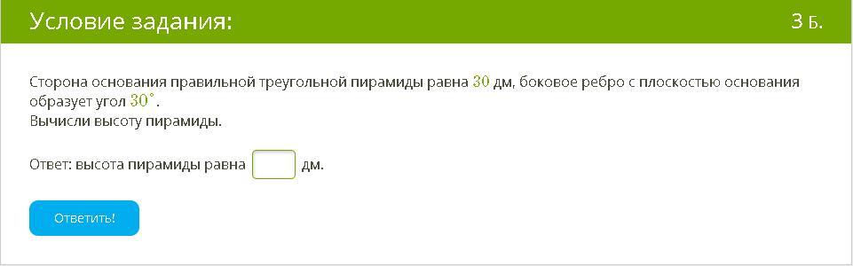 А высота пирамиды может быть найдена, как произведение проекции бок. ребра на тангенс 30°.