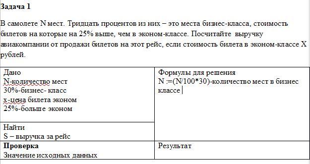 В самолете N мест. Тридцать процентов из них – это места бизнес-класса, стоимость билетов на которые на 25% выше, чем в эконом-классе. Посчитайте выручку авиакомпании от продажи билетов на этот рейс, если стоимость билета в эконом-классе X рублей