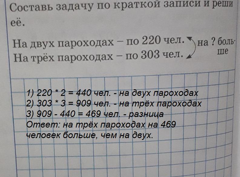 Составь задачу по краткой записи и реши её. На двух пароходах по 220человек, на трех пароходах по 303 человка на ? больше. Помогите пожалуйста!!!