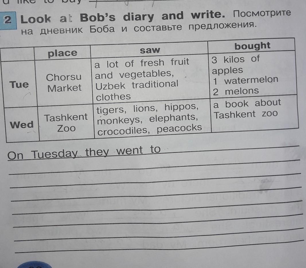 On Tuesday they went to the Chorsu Market and saw a lot of fresh fruit and vegetables and Uzbek traditional clothes. They bought 3 kilos of apples, 1 watermelon and 2 melons