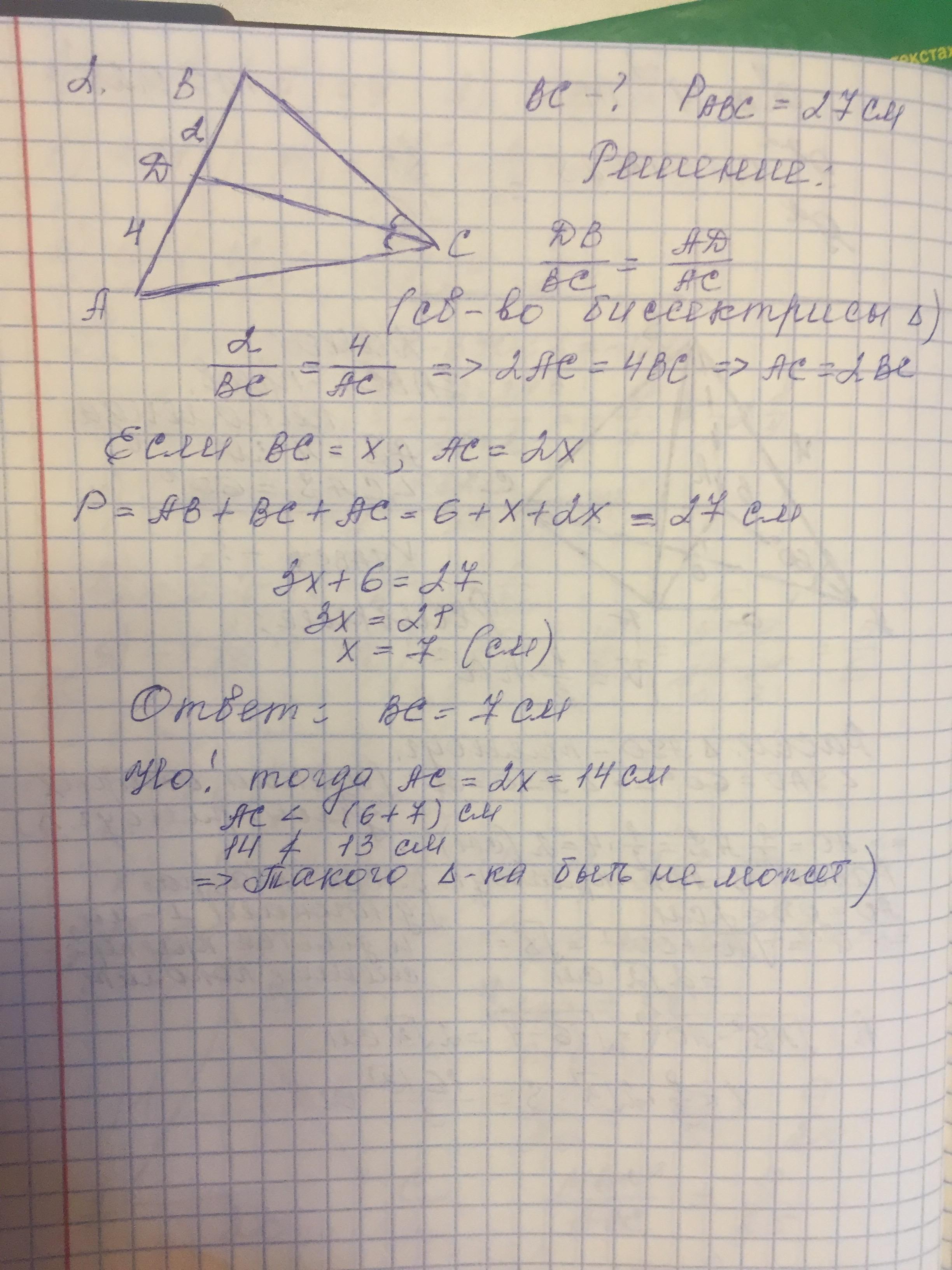 Сторона ВС=7см. ПРОВЕРИМ, может ли такой треугольник существовать, нет, не может. Т.к. (6+7) меньше 14. ТРУБИ ОТБОЙ.) ИЛИ НАДО ПОДКОРРЕКТИРОВАТЬ УСЛОВИЕ.