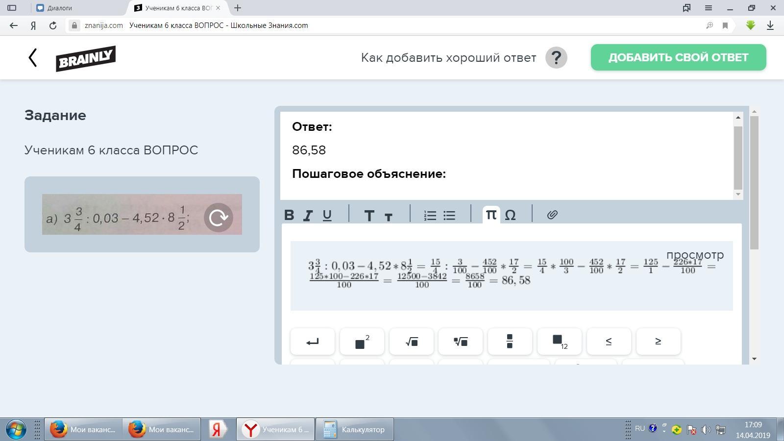 3 3/4 : 0,03 - 4,52 * 8 1/2 = 86,58