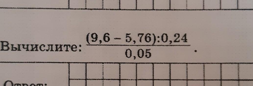 =((9,6-5,76):0,24):0,05= (3,84;0,24):0,05=(384:24);0,05=16:0,05=16*20=320