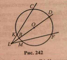 На рис. 242 LD - биссектриса угла CLF, О - центр круга, которое пересекает стороны угла. Докажи, что KC = MF
