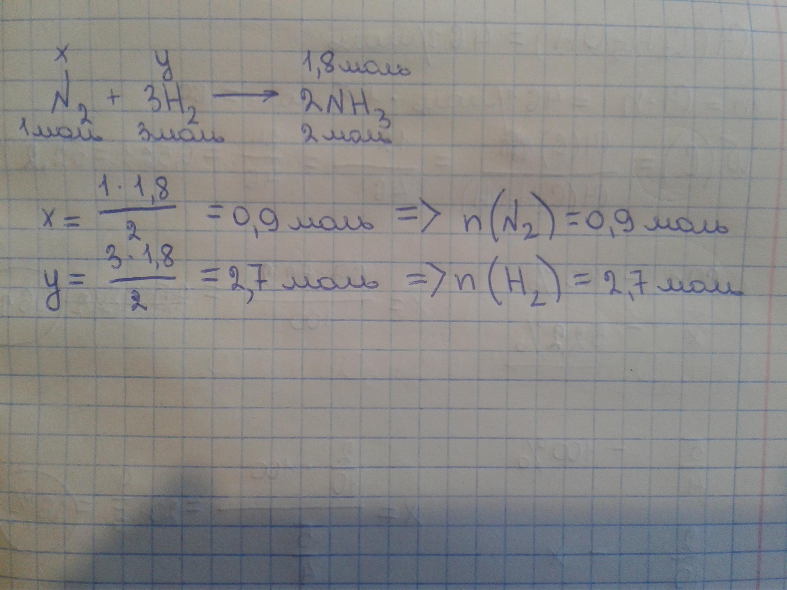 В реакции водорода с азотом образовалось 1,8 моля аммиака NH₃. Составьте уравнение реакции (N₂+3H₂->2NH₃, как я понял). Сколько молей водорода и азота вступили в реакцию?