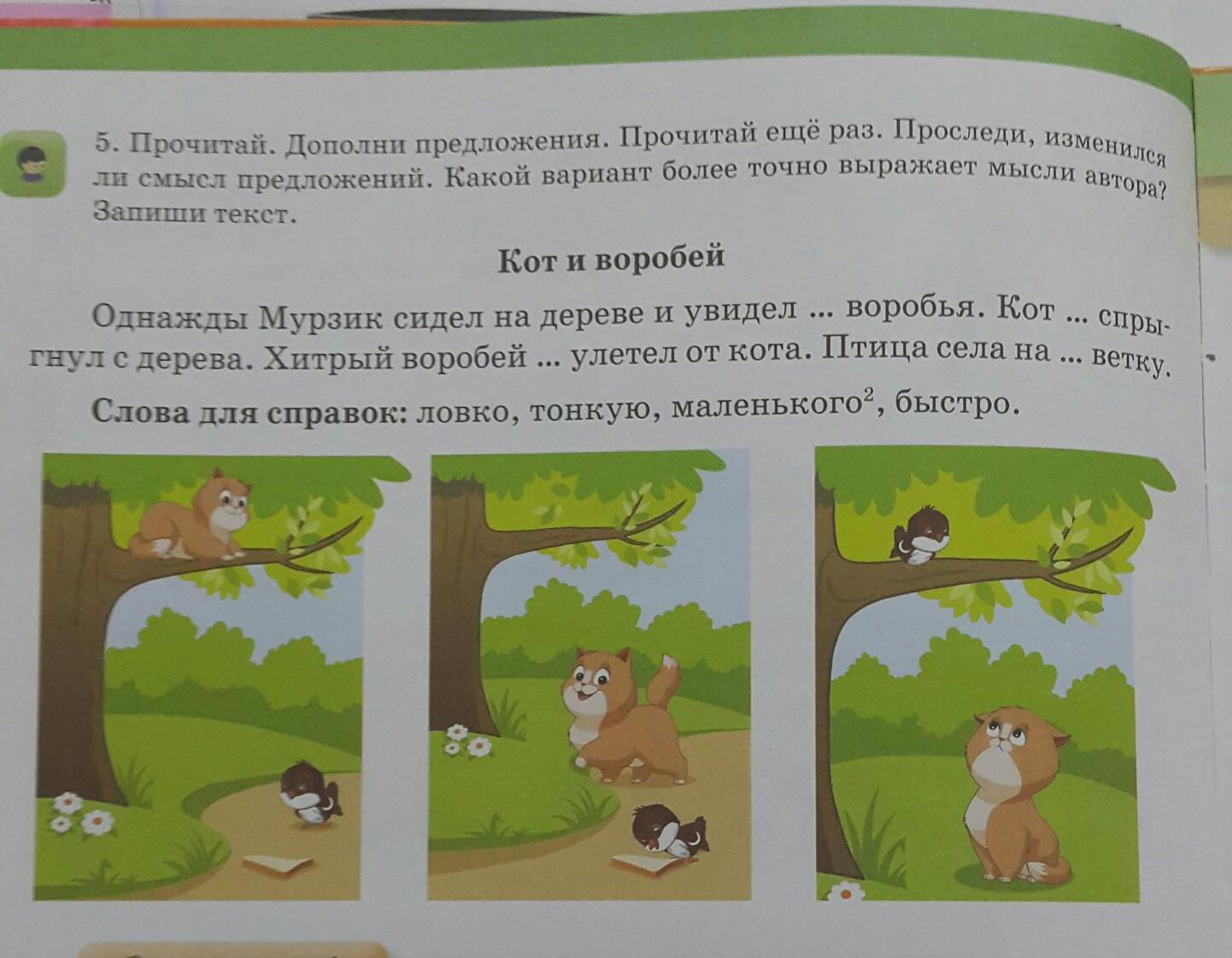 Однажды Мурзик сидел на дереве и увидел маленького воробья. Кот ловко спрыгнул с дерева. Хитрый воробей улетел от кота. Птица села на тонкую ветку.