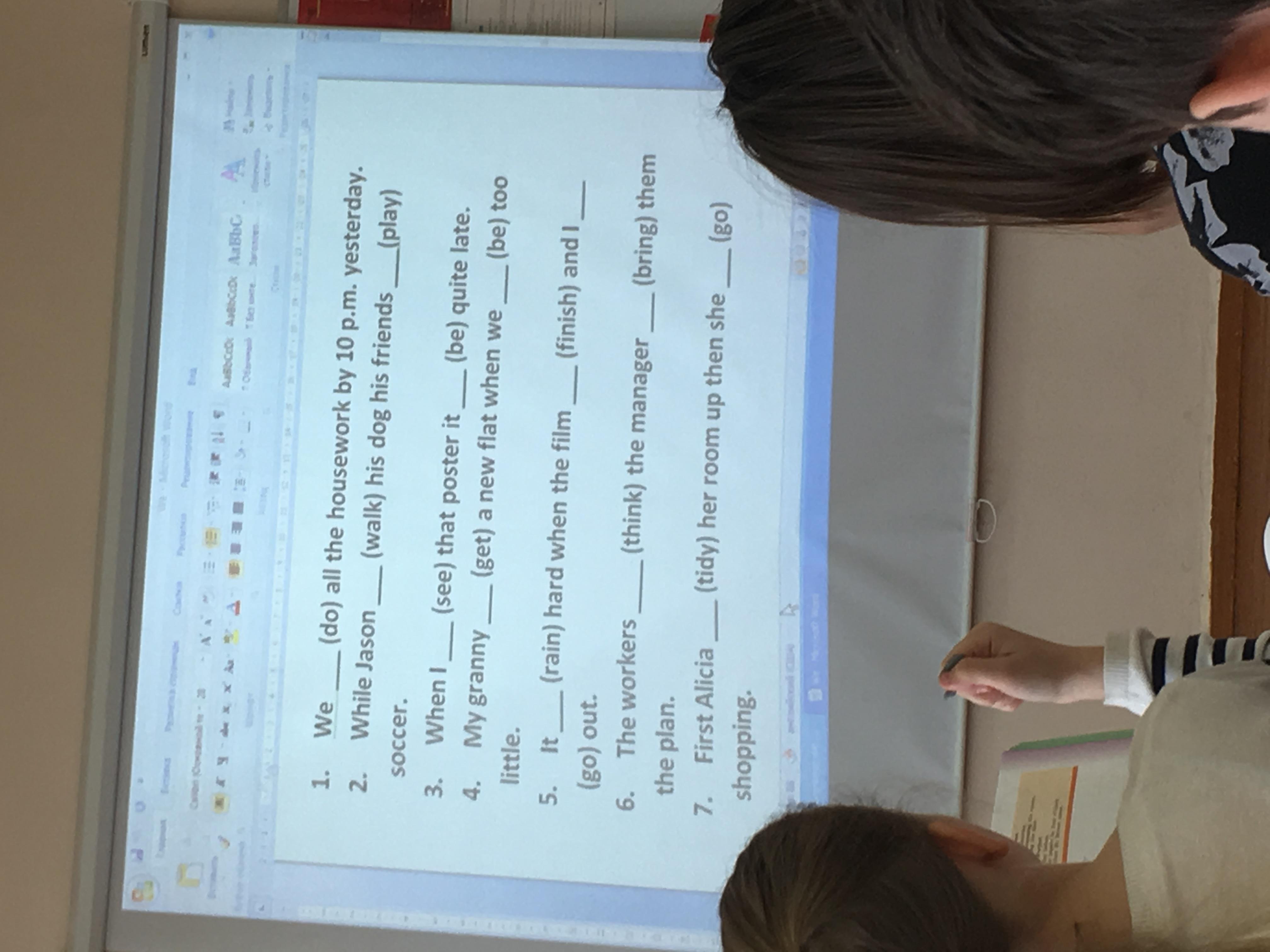 1 had done 2 was walking -were playing 3 saw-was 4 had got - were 5 was raining-had finished-went 6 thought -had brought 7 tidied -went