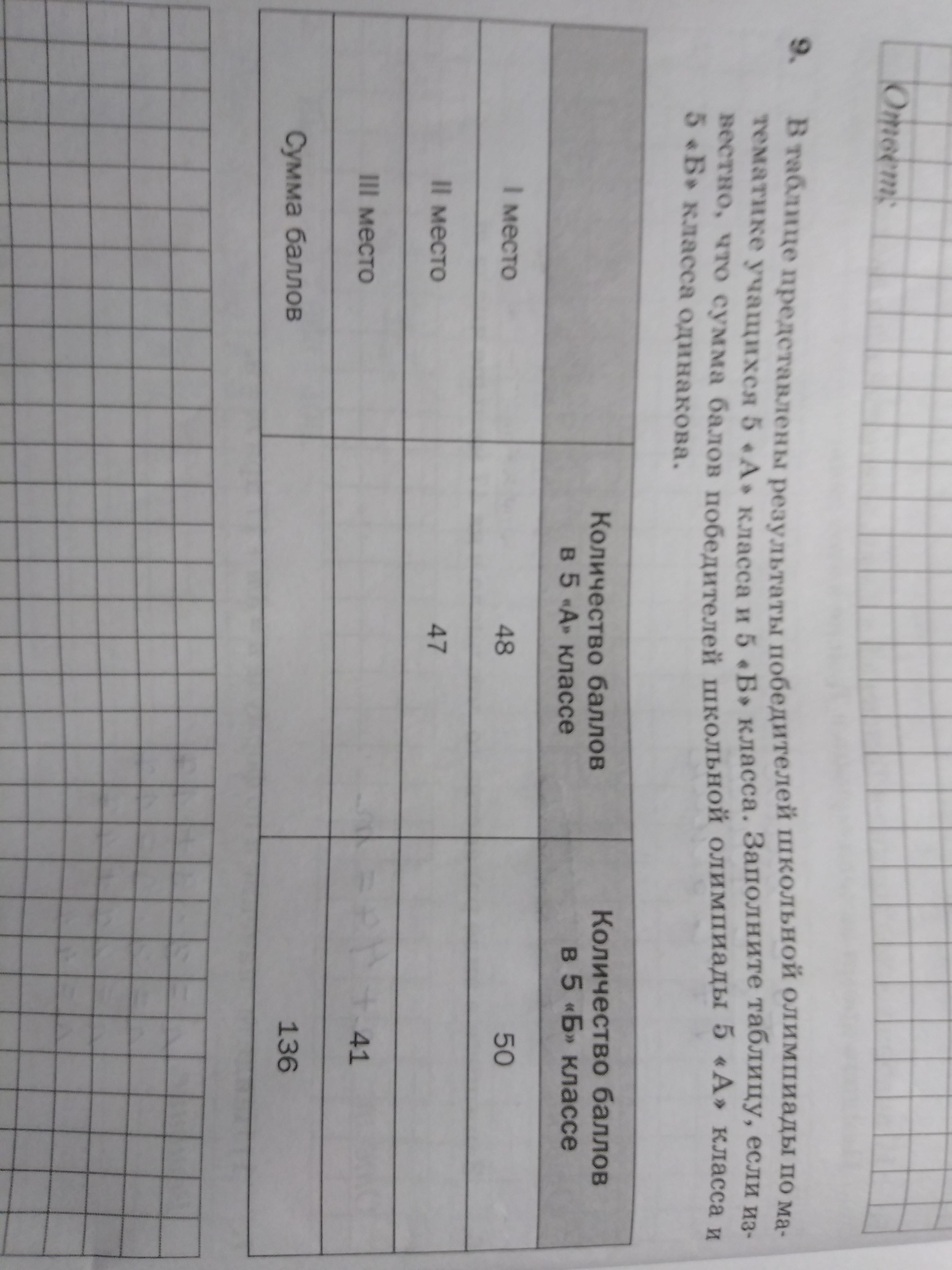 Якщо сума балів 5-а і 5-Б класу однакова (тобто дорівнює) 136,то 136-(48+47)=41. Тому, перша таблиця має такий вигляд: І місце - 48, ІІ місце - 47, ІІІ місце - 41, Всього-136