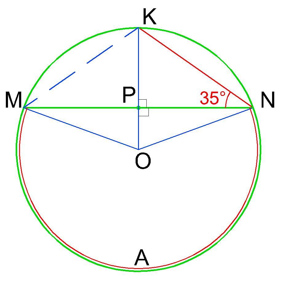 Следовательно, ΔМКН равнобедренный, с известным углом при основании ∠KNP=35°. Значит ∠MKN=180-2*35=110°.