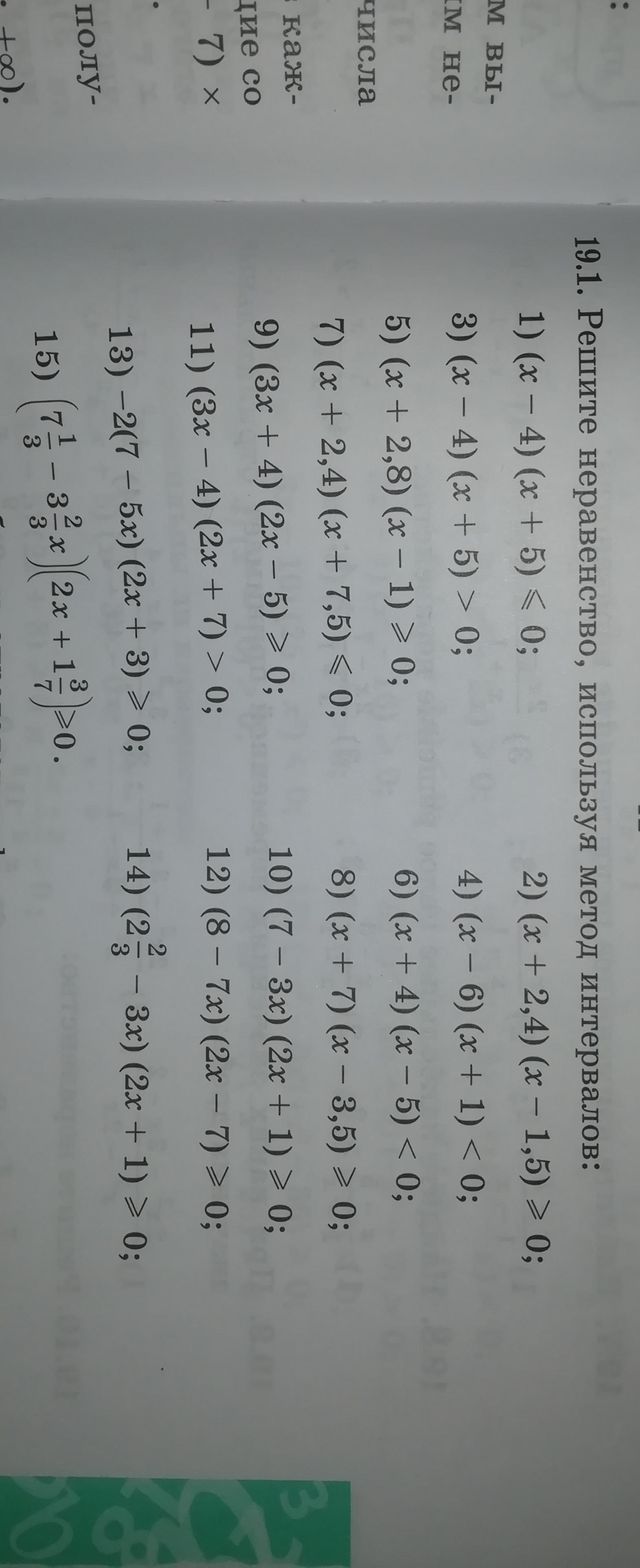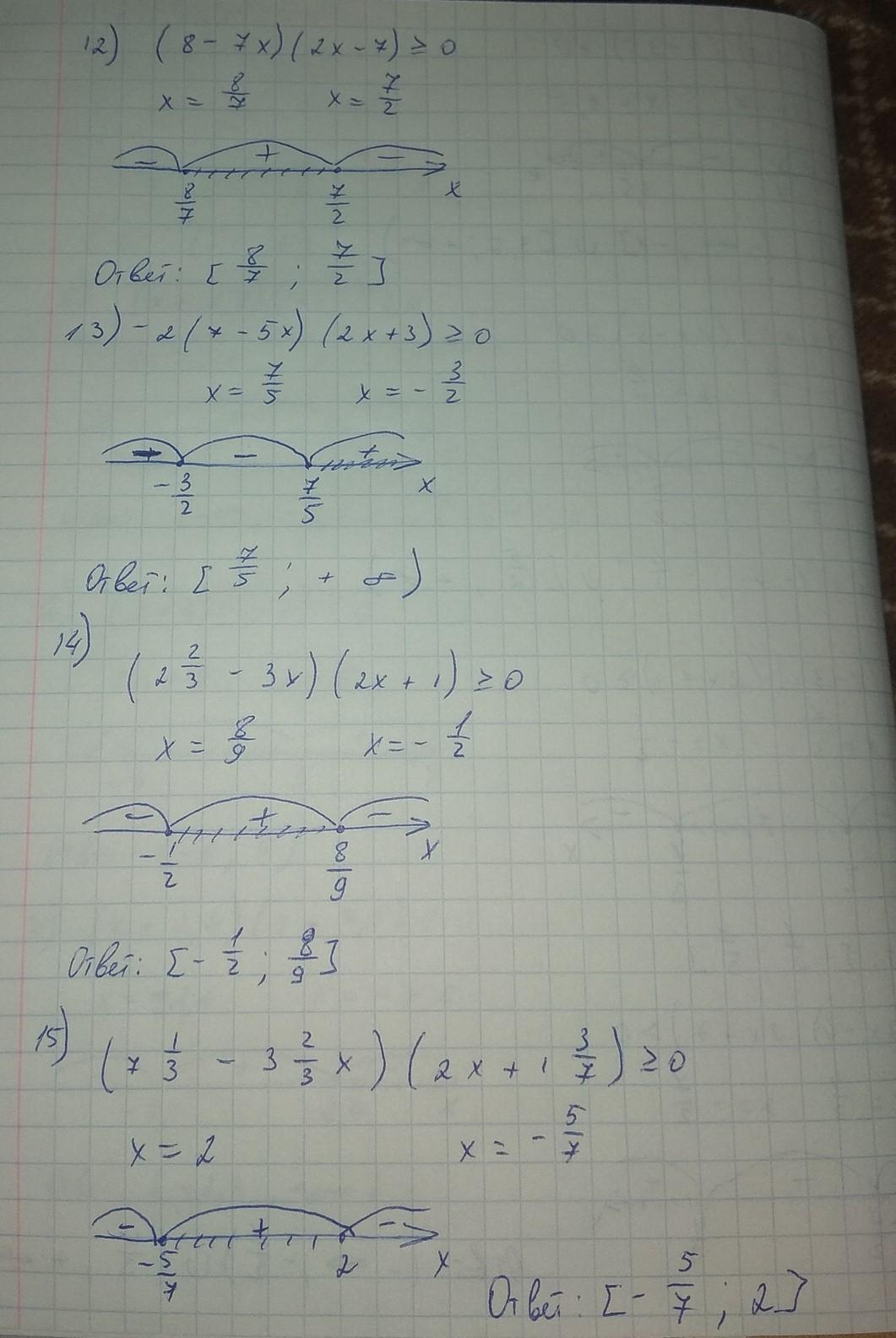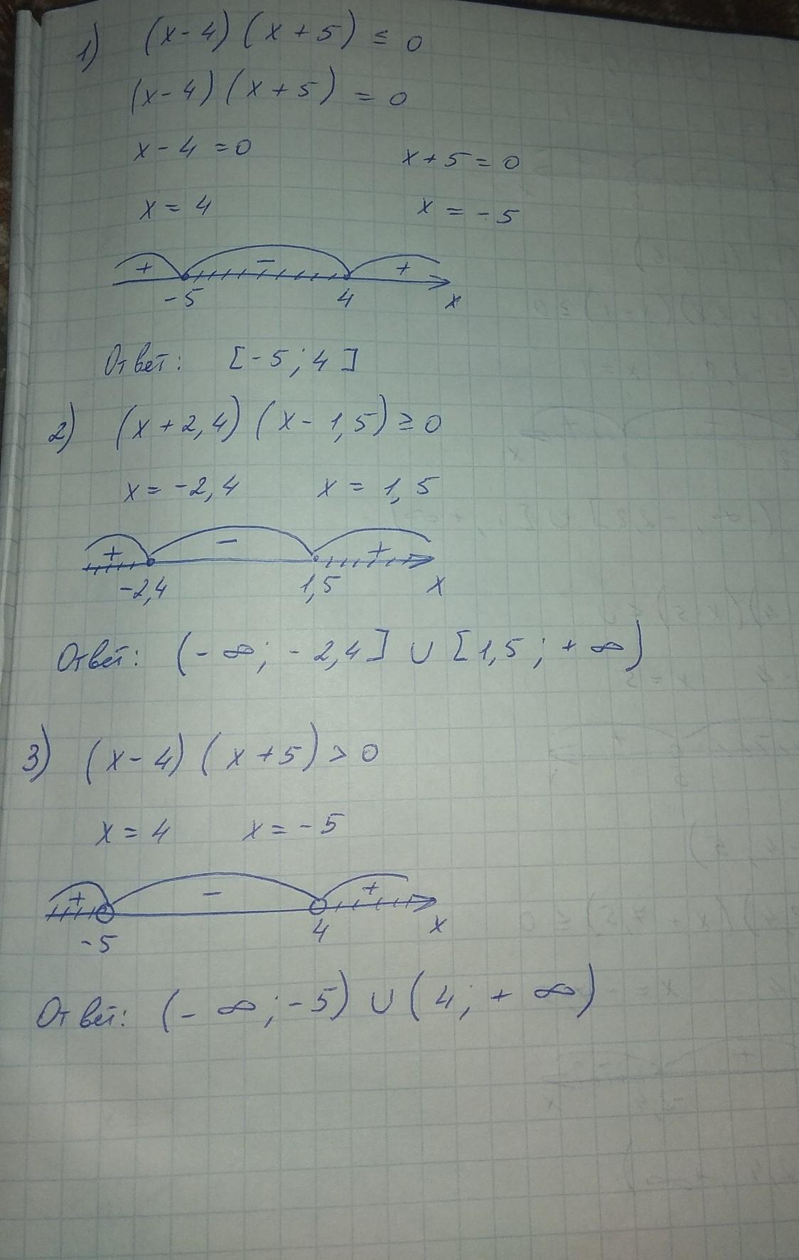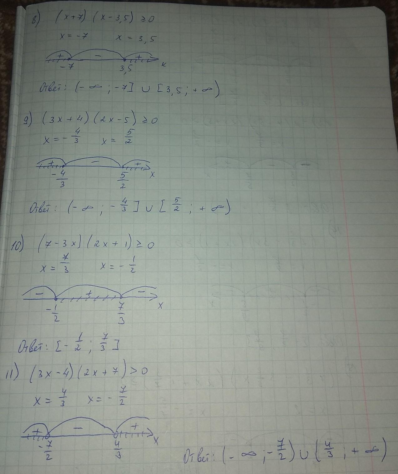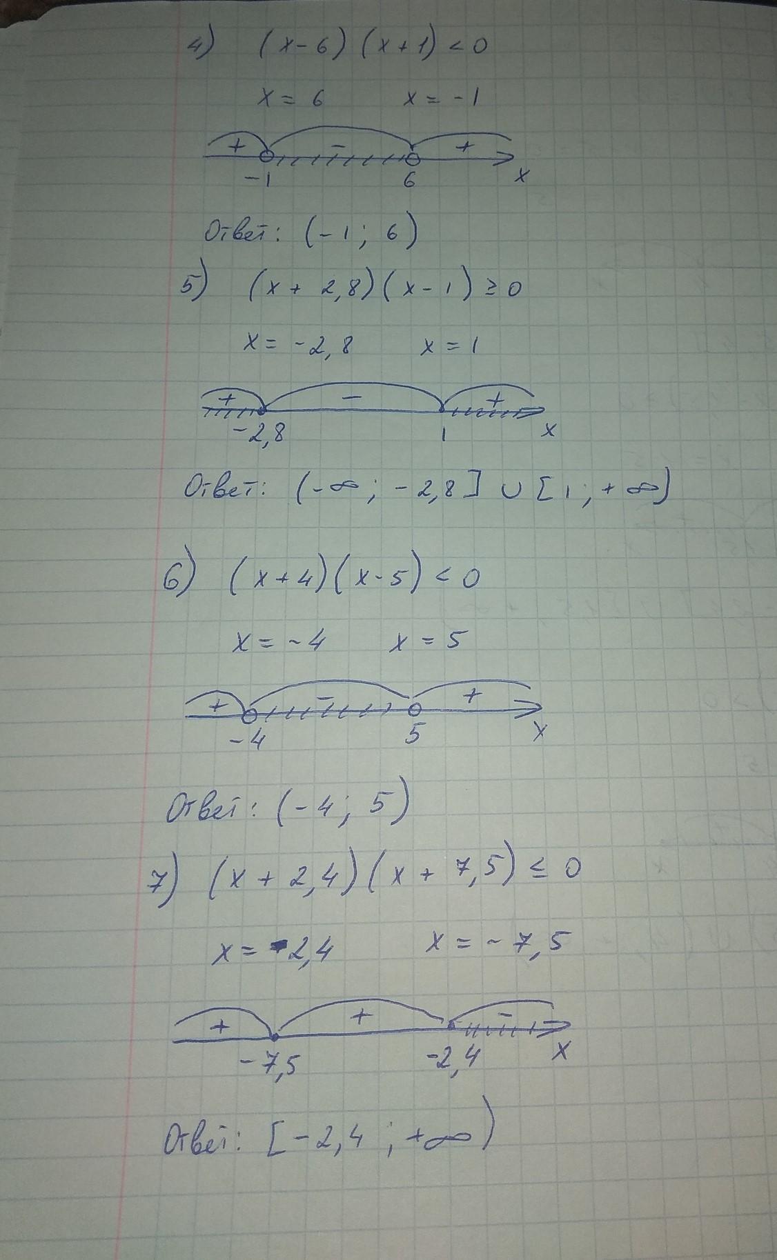 Все на фото, если что каждое выражение приравниваешь к нулю и ищешь корни. В первом расписала, дальше писала только корни. Также, там где выколотые точки, там они выколоты из-за знака в неравенстве, то есть если оно строгое(нет черточки обозначающей равно), то точки выколоты.