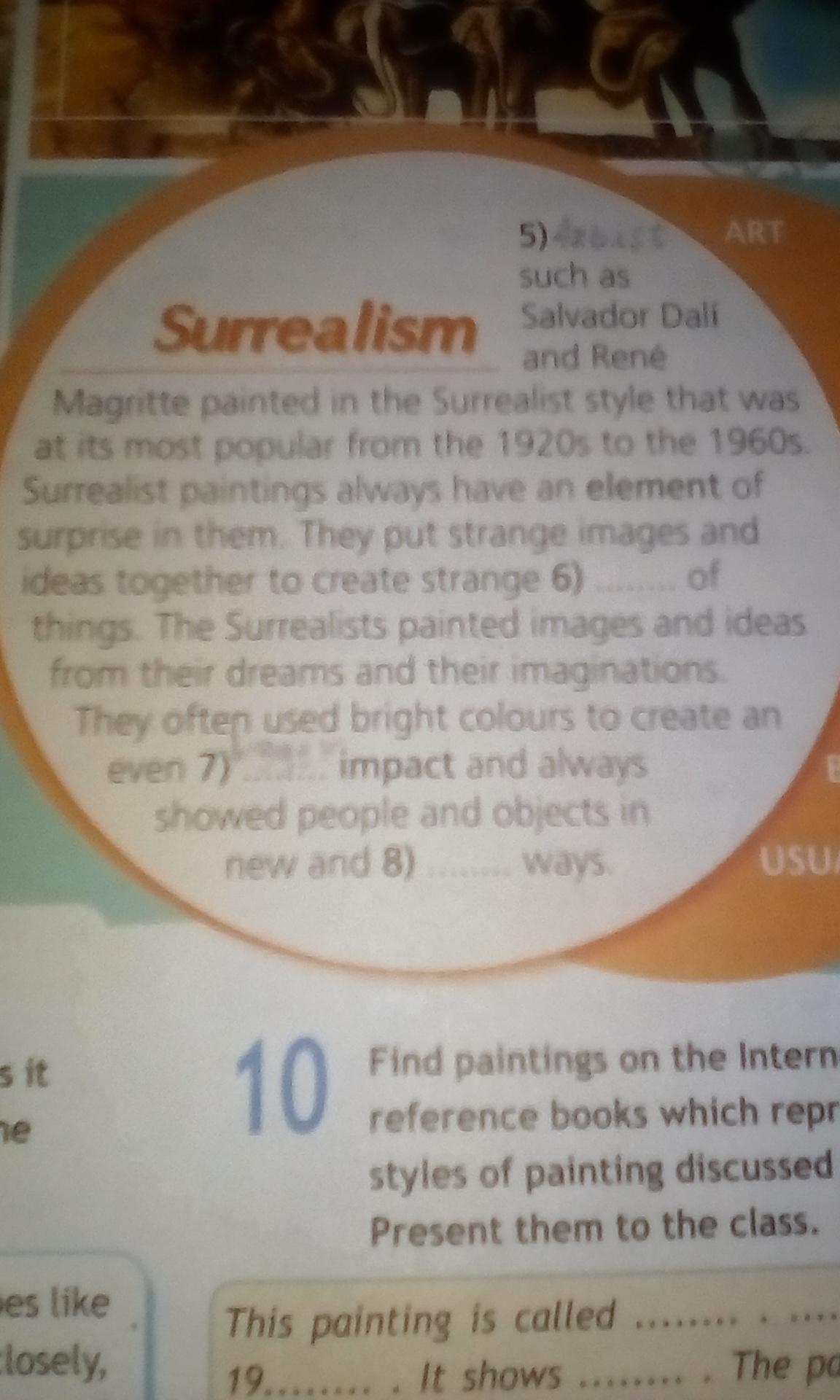 Художники, такие как Сальвадор Дали и Рене Магритт рисовали картины в сюрреалистичном стиле, который был на пике популярности с 1920-х до 1960-х годов. Сюрреалистичные картины всегда несли в себе элемент удивления. Они соединяли друг с другом странные образы и идеи, чтобы создать странные представления вещей. Сюрреалисты изображали образы и идеи, основываясь на своих снах или воображении. Они часто использовали яркие цвета для большего эффекта и всегда показывали людей и предметы новыми и необычными способами.