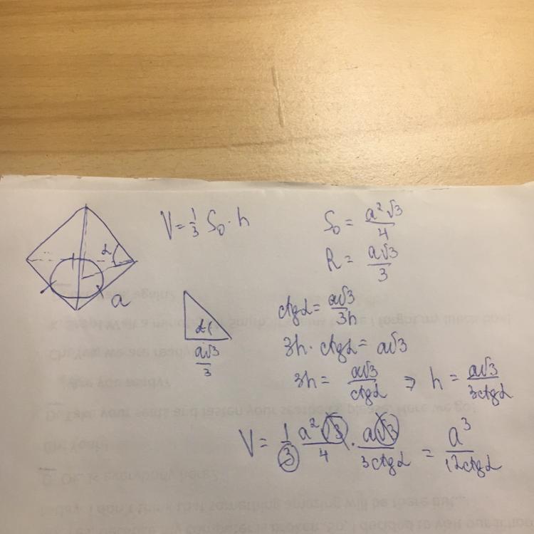 Сторона основания правильной треугольной пирамиды равна а, боковая грань образует с плоскостью основания угол α. Найти объём пирамиды
