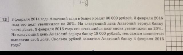 3 февраля 2015 долг увеличился на 20%, т.е. стал 1,2х(36 000 - Х) и равен он сумме, которой вернули в банк, а именно 18000 рублей
