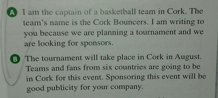 Я капитан баскетбольной команды из Корка. Команда называется Cork Bouncers (Коркские Вышибалы). Я вам пишу потому, что мы планируем участие в турнире и мы ищем спонсора.