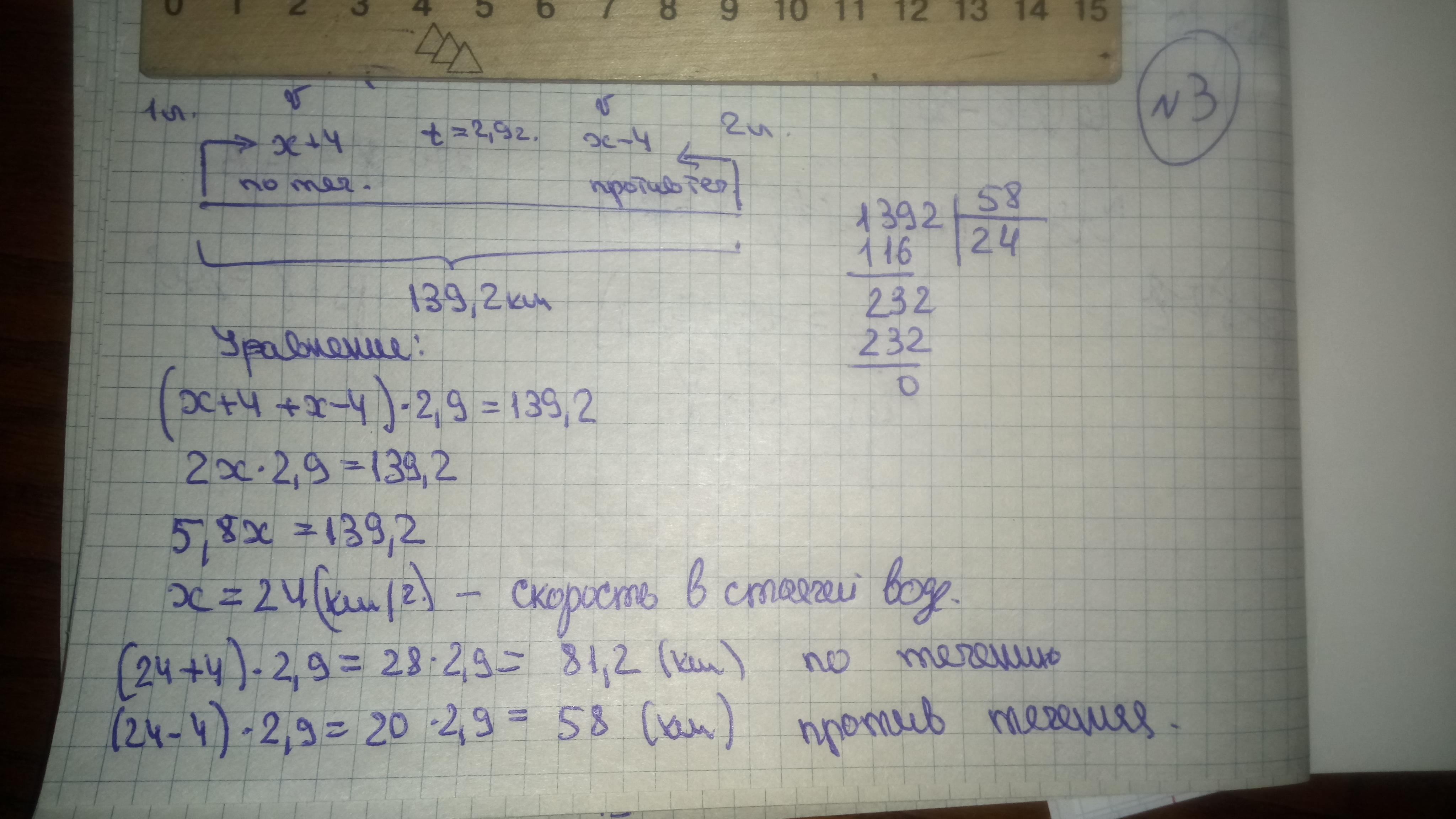 Расстояние между двумя пристанями равно 139,2 км. Из них одновременно навстречу друг другу вышли две лодки, скорости которых в стоячей воде равны. Через 2,9 ч. лодки встретились. Скорость течения реки равна 4 км/ч.
