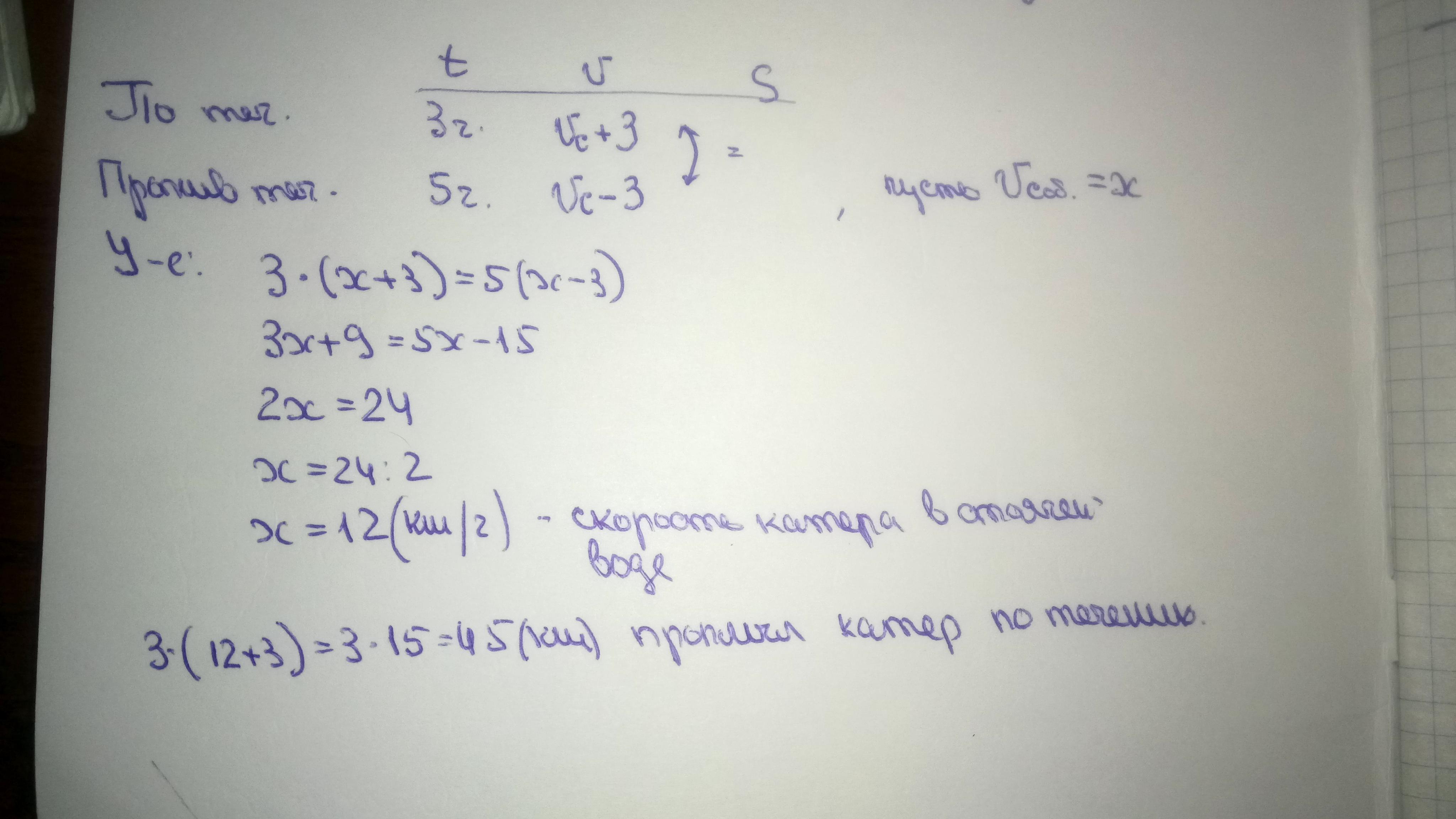 Катер по течению за 3 ч. проплыл такое же расстояние, которое проплывает за 5 ч. против течения. Скорость течения реки равна 3 км/ч. Вычисли скорость катера в стоячей воде.