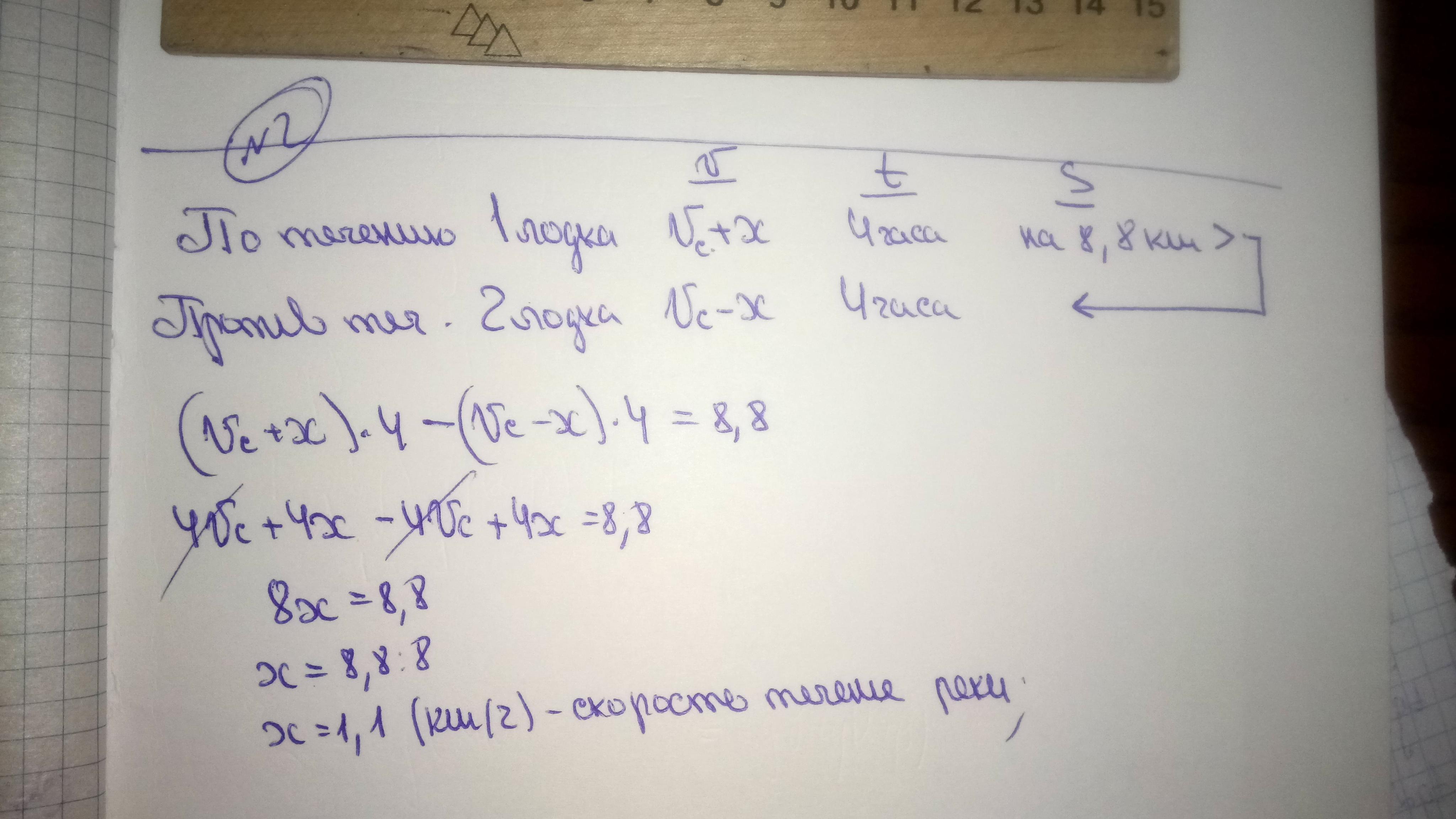 Одновременно от двух пристаней навстречу друг другу отошли две моторные лодки с одинаковыми скоростями. Через 4 ч. они встретились. Лодка, которая плыла по течению, прошла на 8,8 км больше, чем другая лодка. Вычисли скорость течения реки.