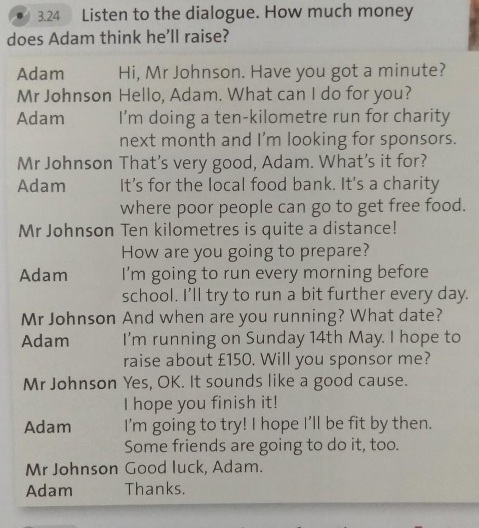 Адам: Я делаю десять километров пробег на благотворительность в следующем месяце, и я ищу спонсоров Мистер Джонсон: Это очень хорошо, Адам. Для чего это?
