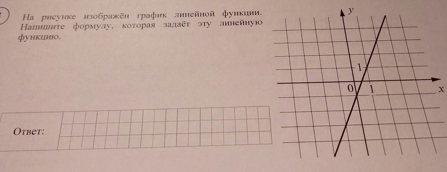 коэффициент при х положительный. Также из графика видно, что прямая проходит через точки ( 0 ; 1 ) и ( 1 ; 1 ). Так как график смещён на одну клетку вниз, то свободный коэффициент равен - 1.