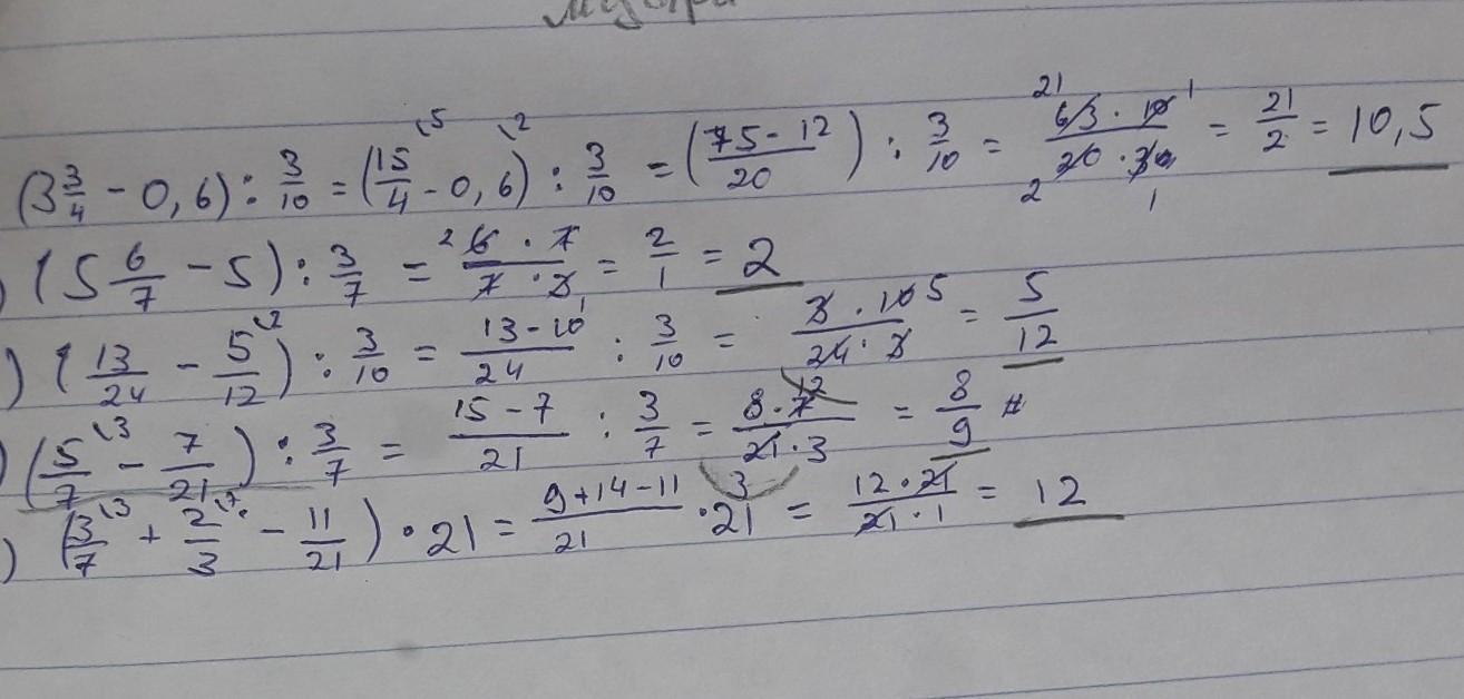 ( 3 3/4 - 0,6 ) ÷ 3/10 = 3 3/20 ÷ 3/10 = 10 1/2 ;