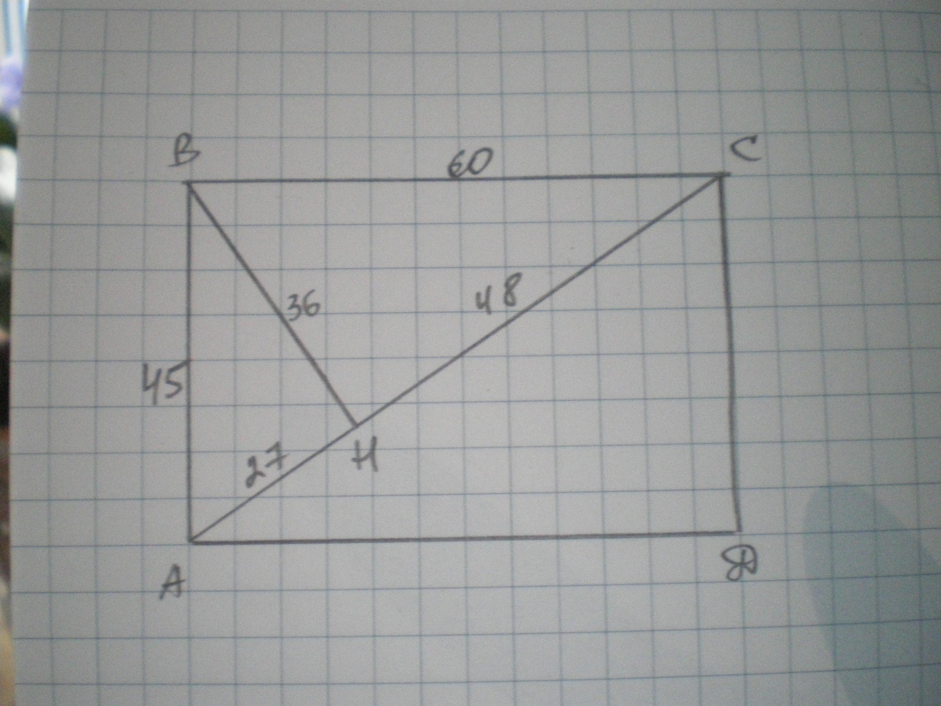 Дано: АВСД - прямокутник, АС - діагональ, ВН⊥АС, АН=27 см, СН=48 см. Знайти S(АВСД).