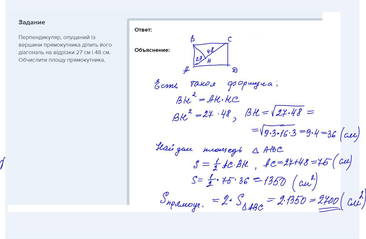 Перпендикуляр, опущений із вершини прямокутника ділить його діагональ на відрізки 27 см і 48 см. Обчислити площу прямокутника.