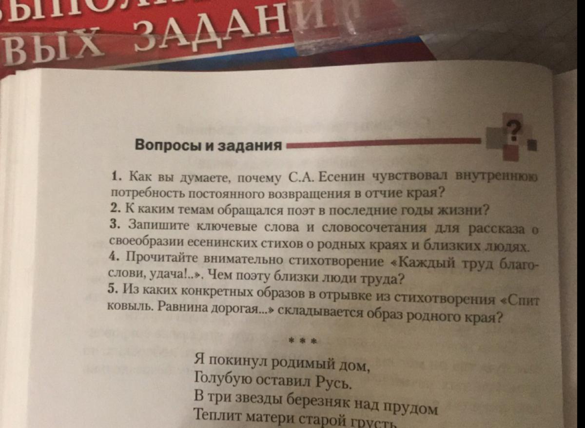 1. С.Есенин, был очень сильно горд своей родиной, а также считал себя не отъемлемой частью ее, поэтому и не мог без нее жизнь, и постоянно думал о ней и писал стихи, и рассказы, ведь его душа постоянно верна была своему родному краю.