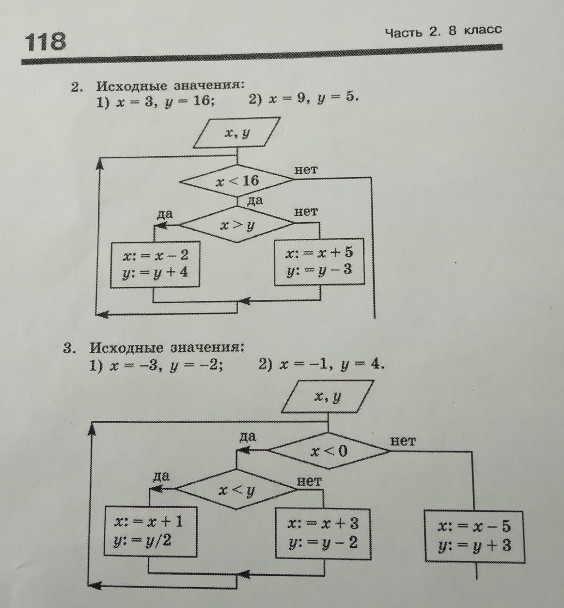 1. х<16 и больше у, уходим на ветку да. х=9-2=7, у=5+4=9.