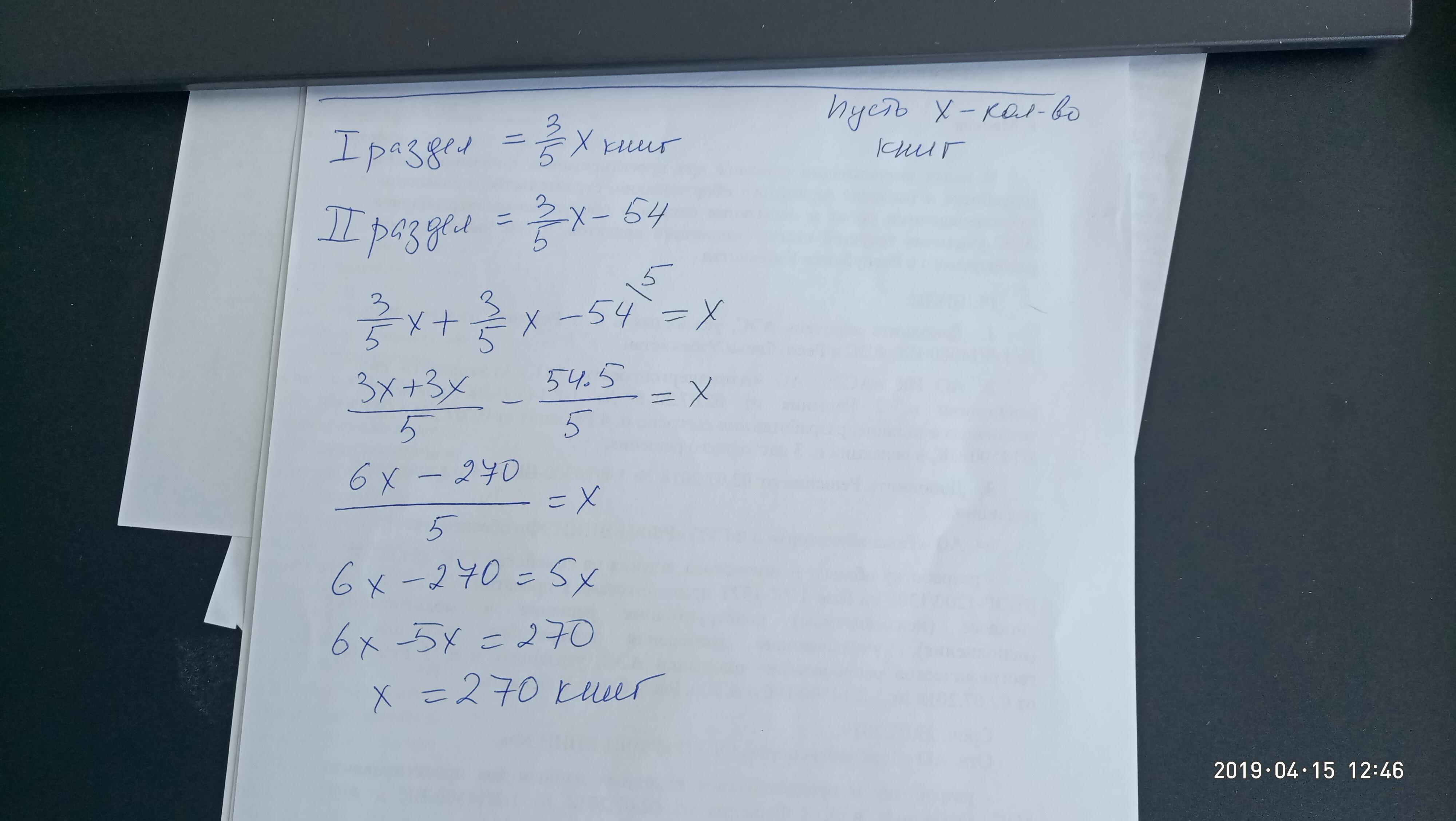 Книга состоит из двух разделов. Первый содержит 3/5 всего количества страниц, а во втором разделе на 54 страницы меньше, чем в первом. Сколько страниц в книге?