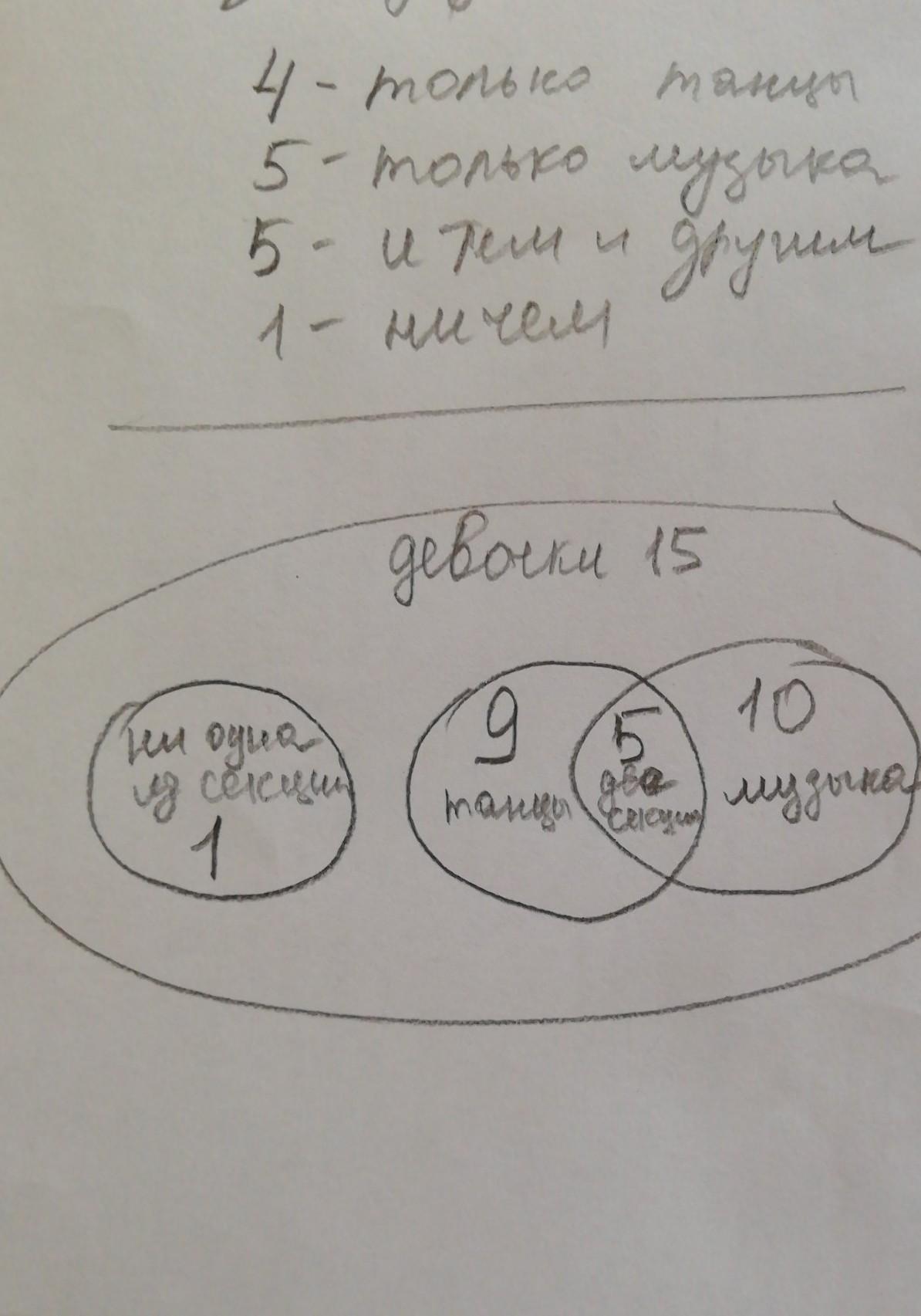 В классе 15 девочек. Из них 10 человек занимаются в музыкальной школе и 9- бальными танцами. Только одна из девочек не ходит ни в какую из данных секций. Сколько девочек занимаются в музыкальной школе и занимаются бальными танцами?