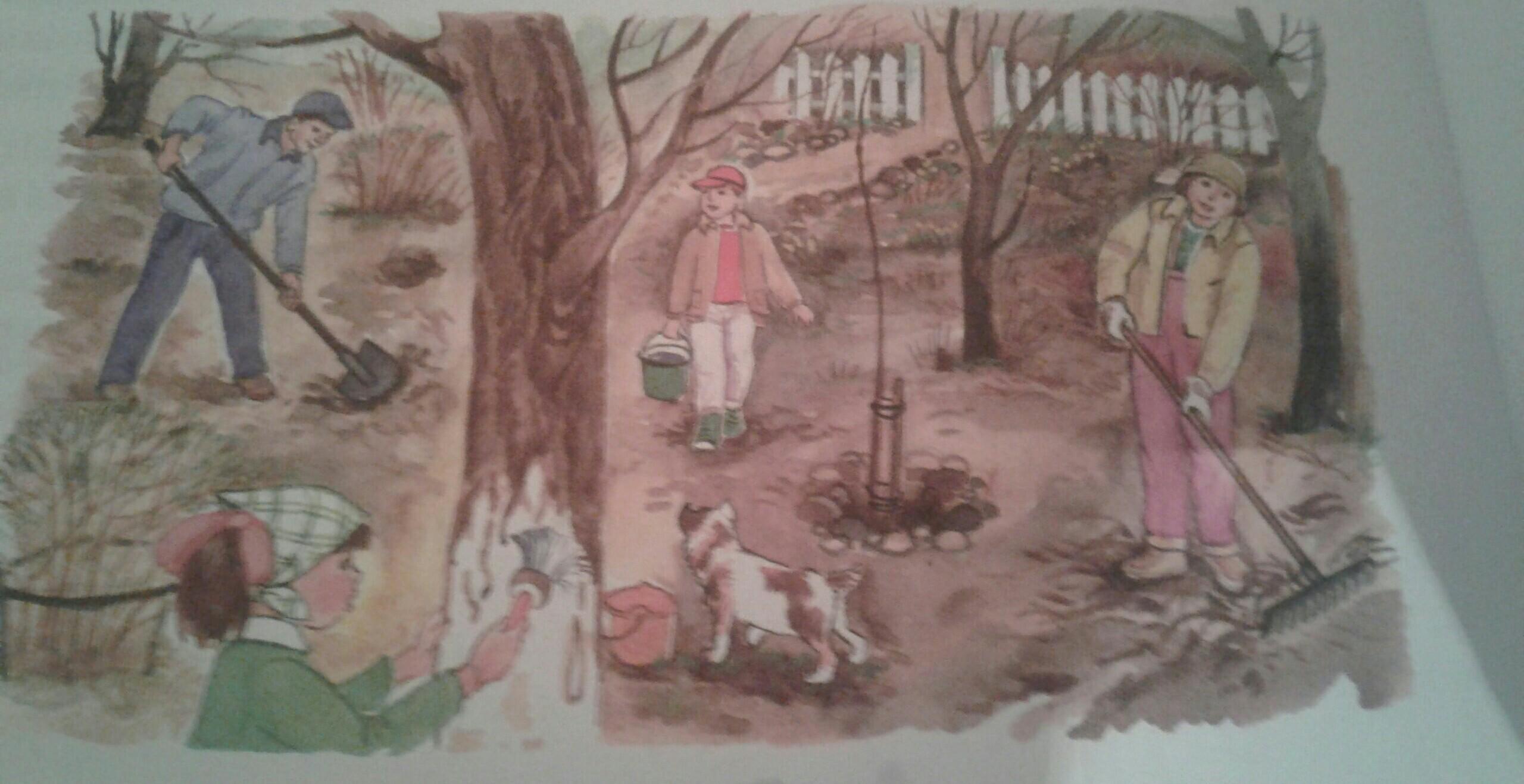 Ответ: мы все работаем в огороде, Папа коплет Мама грабкает я белю деревя , а брат помогает мне. Мы все помогаем друг другу. Никто не жалеется все щаняты своей роботой.