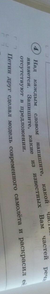 Ответ: Петин-прил. друг-сущ. сделал-глагол модель-сущ. современного-прил. самолёта-сущ. и-союз раскрасил-глагол её-местоимение.