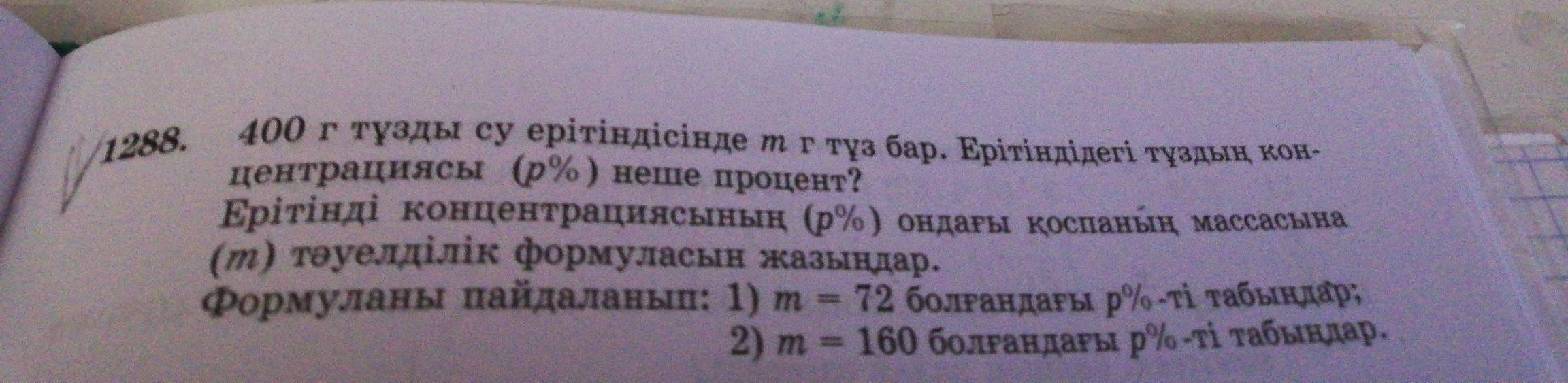400 г тұзды су ерітіндісінде m г тұз бар. Ерітіндідегі тұздық концентрациясы (p%) неше процент? Ерітінді концентрациясысның (p%) ондағы қоспаның массасына (m) тәуелділік формуласын жазыңдар. Формуланы пайдаланып: 1) m=72 болғандағы p%-ті табыңдар; 2) m= 160 болғандағы p%-ті табыңдар. Шығарсаңыздар көмектесіңіздерші өтініш!