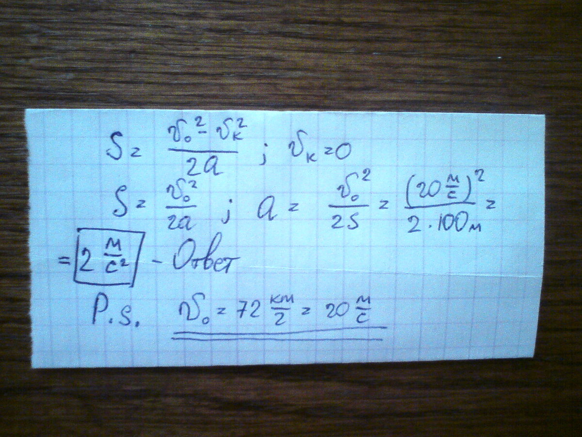 Автомобиль при торможении до полной остановки прошел расстояние 100 м. С каким ускорением он двигался, если начальная скорость его движения была 72кмч?