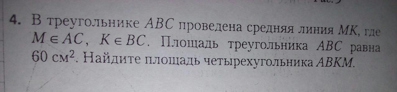 Площади подобных фигур относятся как квадраты соответствующих линейных размеров. Т.к. Треугольники АВС и МКС подобны по 1 признаку подобия, по двум углам, у них угол С - общий, а ∠СМК=∠САВ, как соответственные при МК║АВ, (по свойству средней линии МК) и секущей АС, то площадь треугольника АВС относится к площади треугольника МКС, как 4/1. т.е. площадь треуг. МКС равна 15 см², тогда площадь АВКМ равна