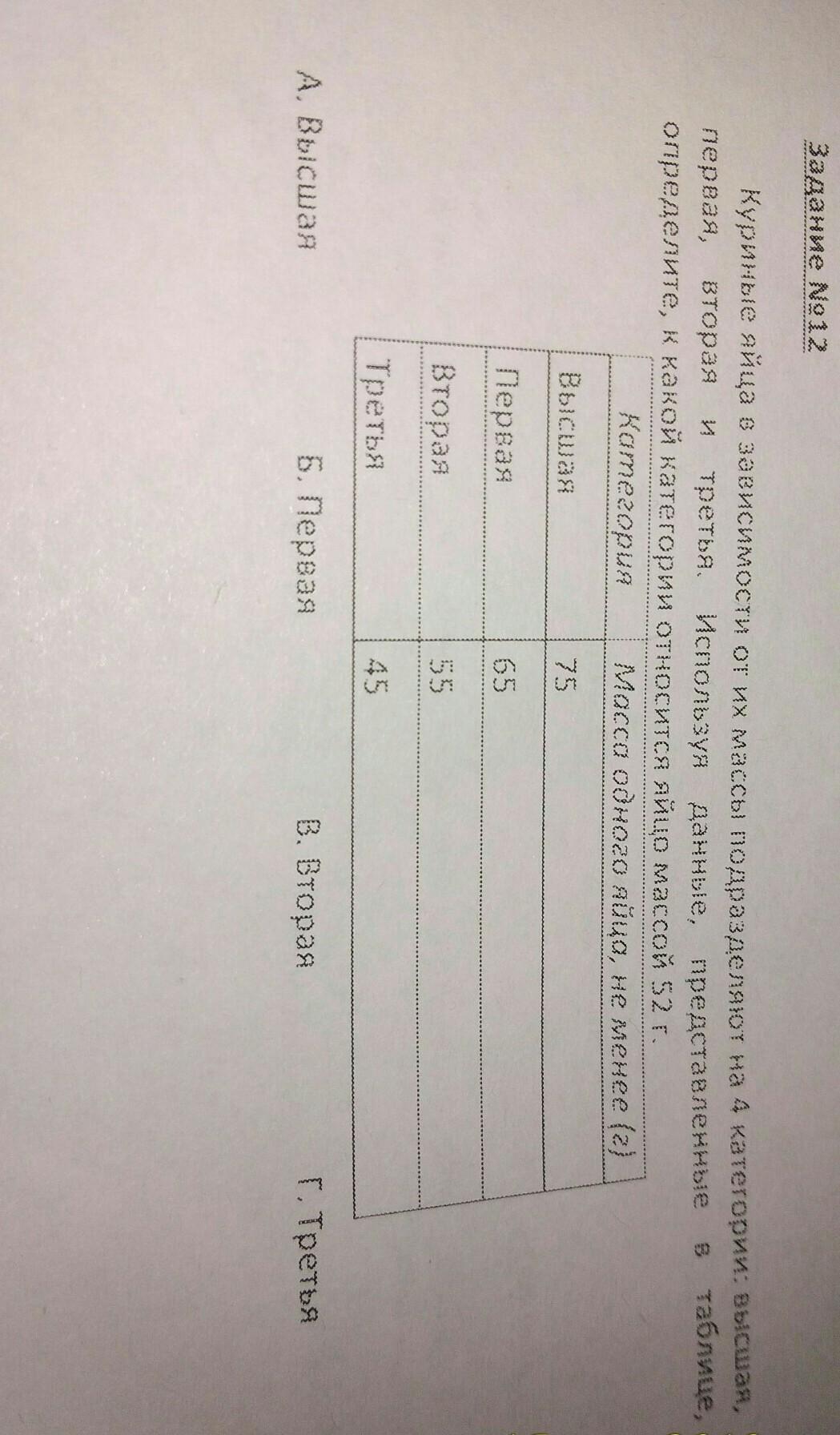 Для каждой категории вес должен быть либо =, либо >, в нашем случае 55>52<45, значит яйцо относим к третьей категории