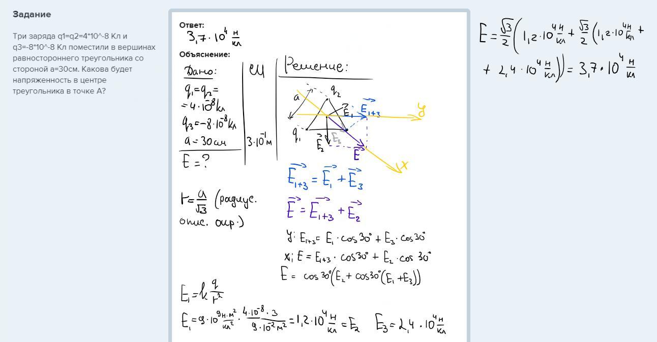 Три заряда q1=q2=4*10^-8 Кл и q3=-8*10^-8 Кл поместили в вершинах равностороннего треугольника со стороной a=30см.какова будет напряженность в центре треугольника в точке А?