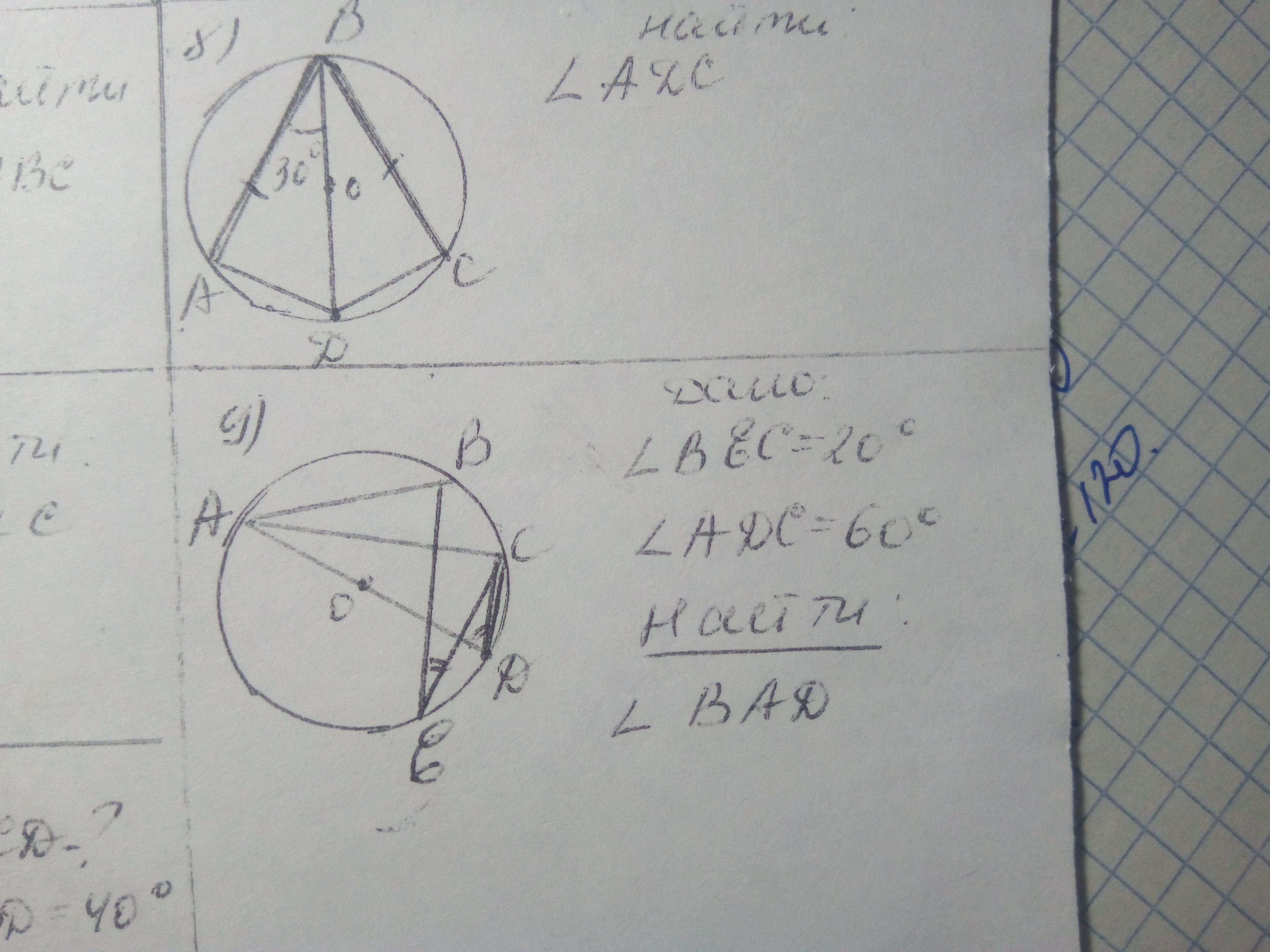 3. Дуга ВАД= дуга ВС+дуга СД=40+60=100. Т.к. вписанный угол, равен половине дуги на которую он опирается, то угол ВАД=100:2=50.