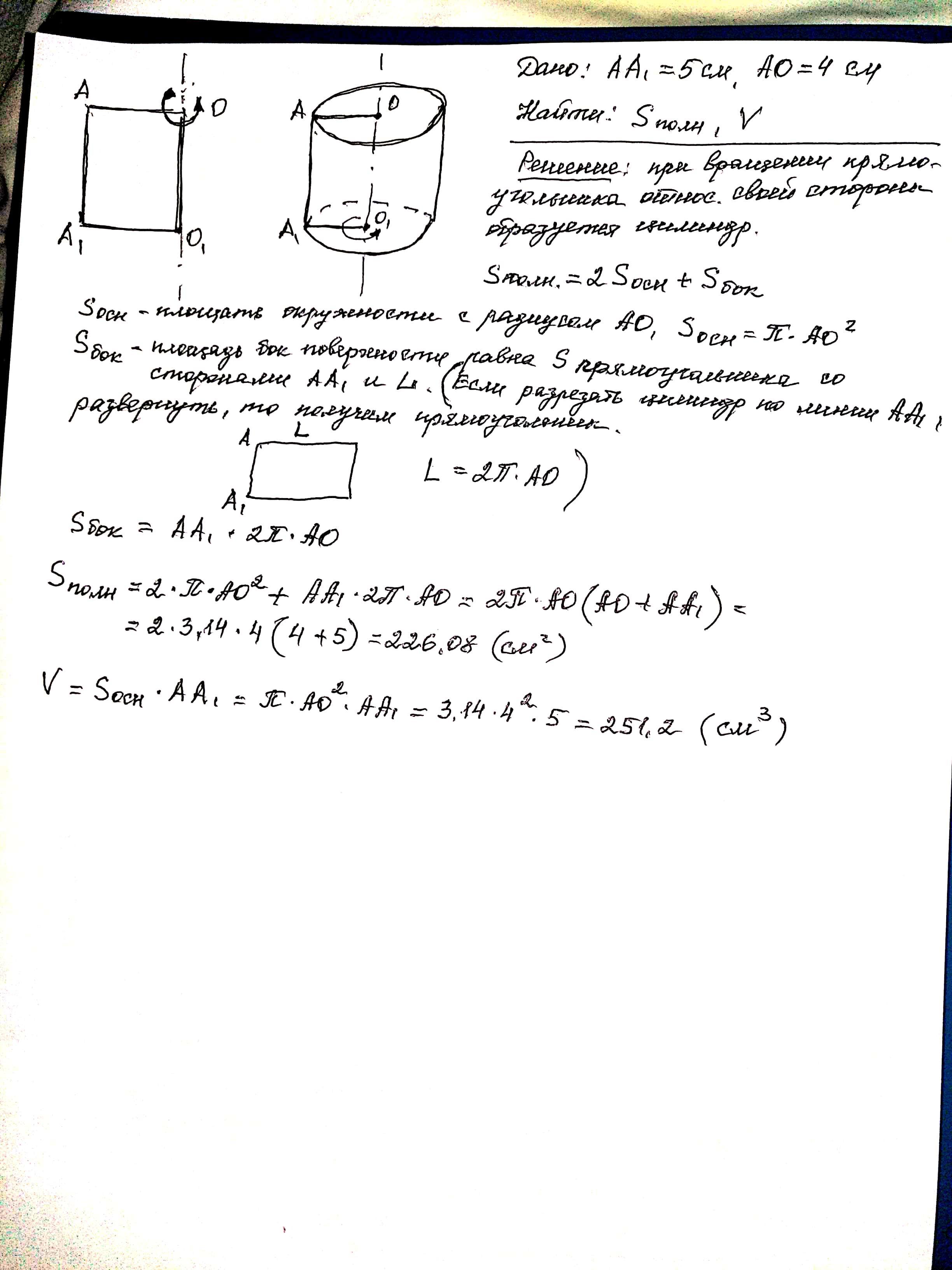 Помогите пожалуйста!все очень плохо..Прямоугольник со сторонами 5 см и 4см вращается вокруг большой стороны.Найдите площадь полной поверхности площадь и обьем полученного тела вращения.