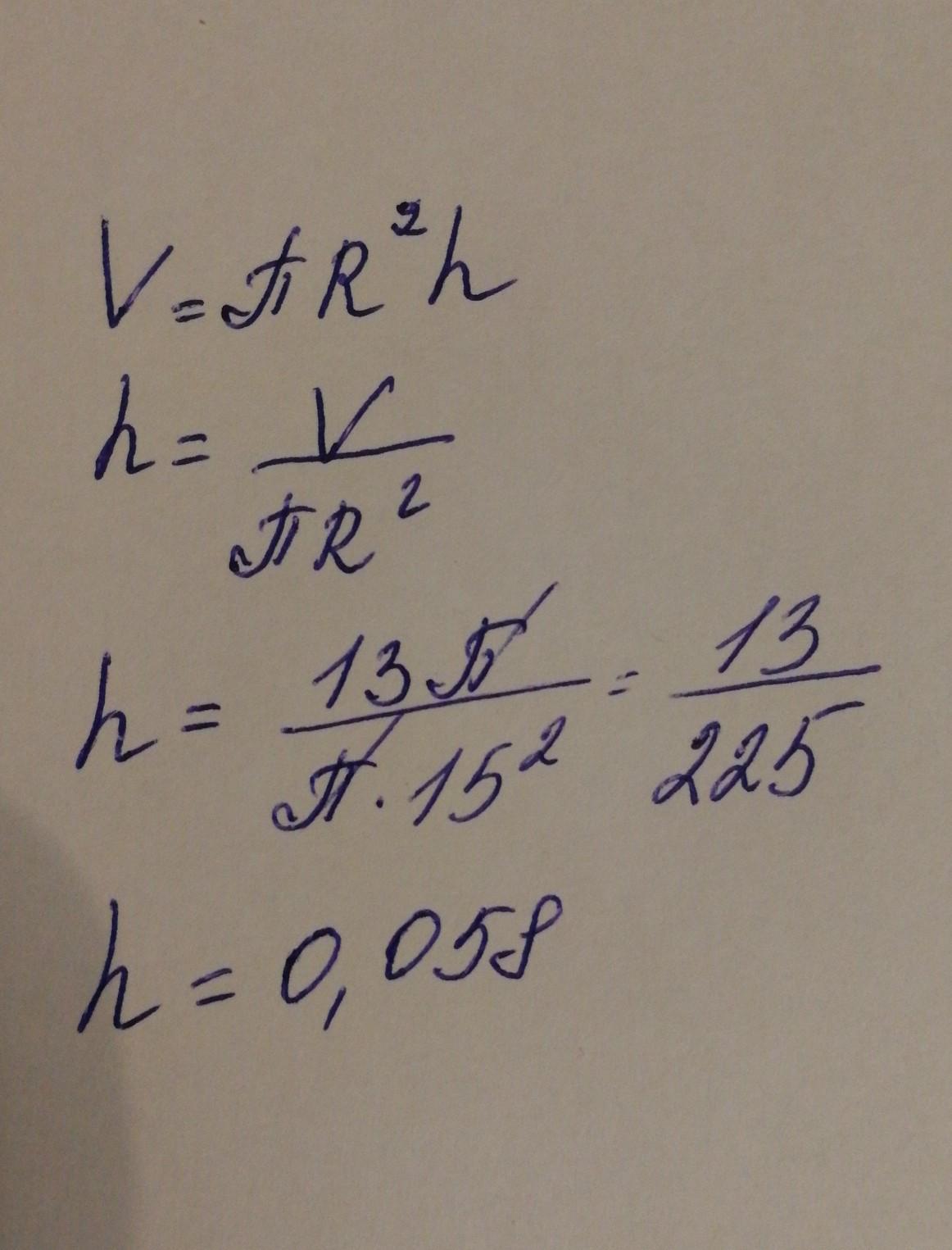 Объём цилиндра вычисляется по формуле V=π⋅R2⋅h, где V — объём, h — высота цилиндра. Пользуясь этой формулой, определи значение h, если V=13⋅π, R=15. (Ответ округли до тысячных).