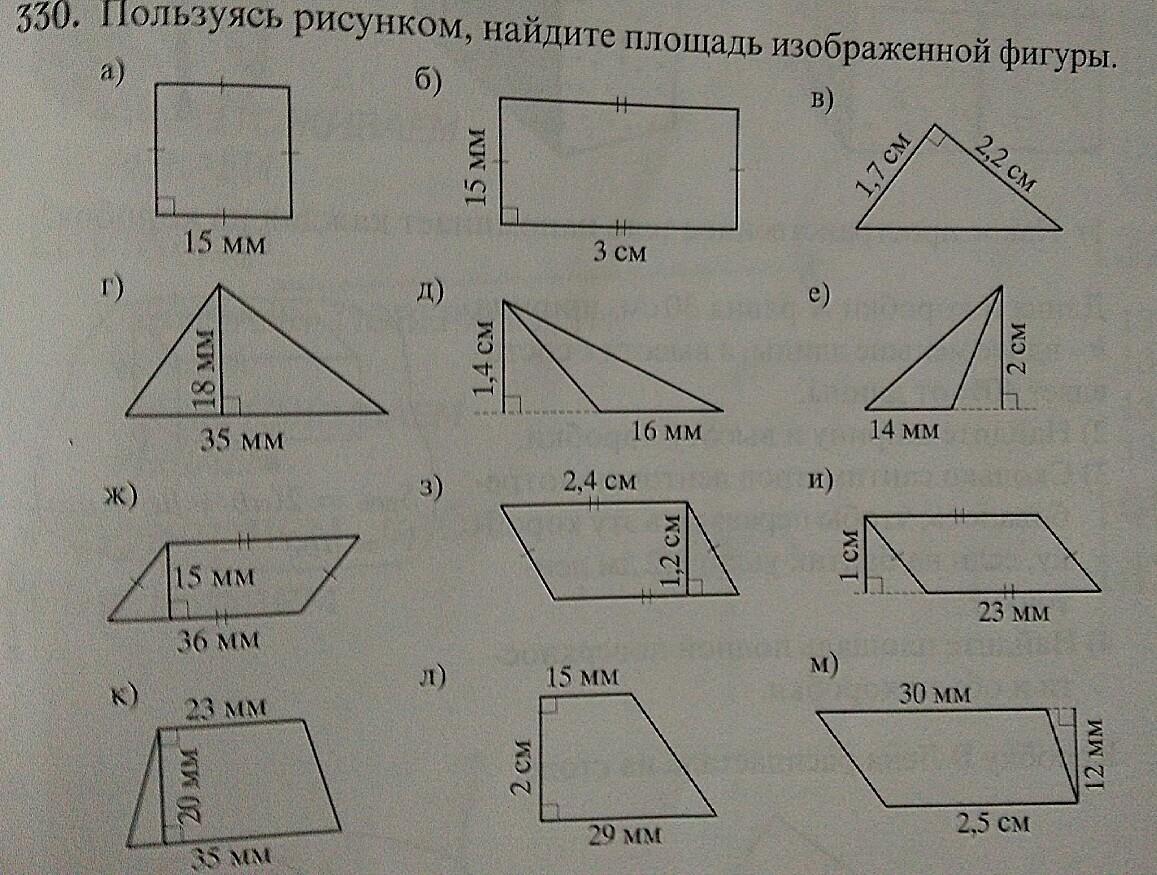 д) 16мм=1,6см S=(1,4х1,6)/2=1,12 см²