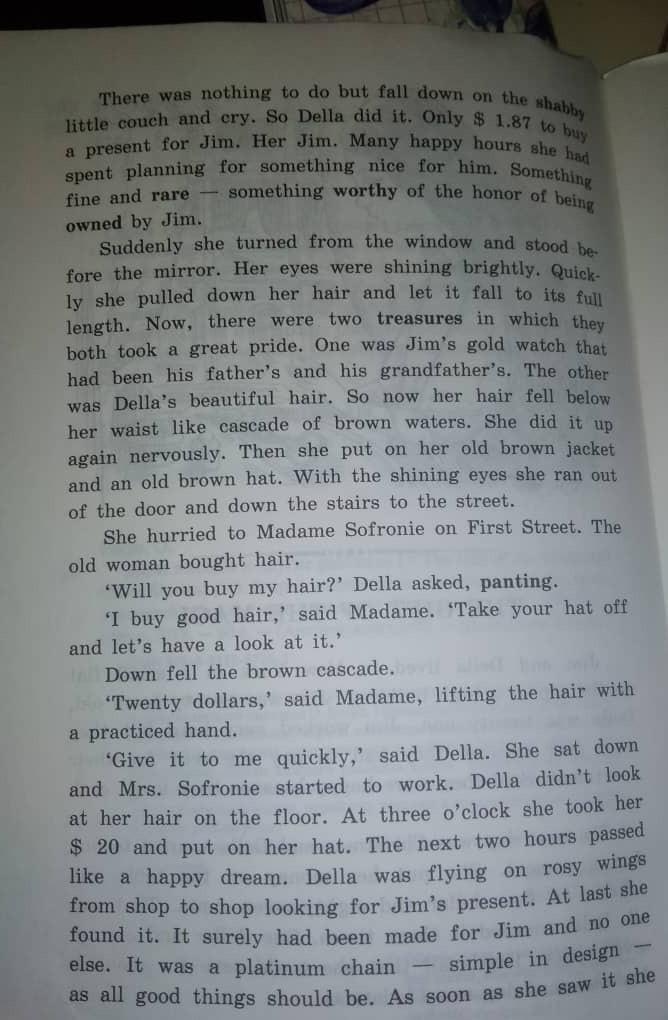 8:55 Ничего не поделаешь, как упасть на маленькую кушетку. Бо Делла сделал это. Только $ 1,87 на подарок для Джей потратили на планирование чего-то приятного для него. Что-то в порядке, а что-то достойное чести быть принадлежащим Джиму. я. Ее Джим. Много счастливых часов она внезапно отвернулась от окна и встала перед зеркалом. Ее глаза ярко сияли. Очень быстро она стянула свои волосы и позволила им упасть во всю длину. Теперь было два сокровища, которыми они оба гордились. Одним из них были золотые часы Джима, которые были у его отца и деда. Это были красивые волосы Деллы. Так что теперь ее волосы упали ниже ее талии, как каскад коричневых вод. Она сделала это снова нервно. Затем она надела свою старую коричневую куртку и старую коричневую шляпу. Сияющими глазами она выбежала из двери и спустилась по лестнице на улицу. Другой Она поспешила к мадам Софрони на Первой улице. Старуха купила волосы. Ты купишь мои волосы? Спросила Делла, тяжело дыша. Я покупаю хорошие волосы, сказала мадам. «Сними шляпу и давай посмотрим на нее». Вниз упал коричневый каскад. Двадцать долларов, - сказала мадам, поднимая волосы опытной рукой. Дайте мне это быстро, - сказала Делла. Она села, и миссис Софрони начала работать. Делла не смотрела на свои волосы на полу. В три часа она взяла свою S 20 и надела шляпу. Следующие два часа прошли как счастливый сон. Делла летела на радужных крыльях из магазина в магазин в поисках подарка Джима. конечно же. Это было так же хорошо для Джима, и никто не заглянул в ЗАКРЫТЬ, как он скоро ее увидит